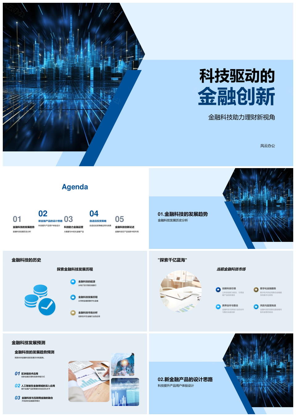 风云办公提供的科技驱动金融智创理财新未来PPT模板,下载格式为pptx,一共23页,作品中文字及图均可以修改和编辑,图片更改请在作品中右键图片并更换,文字修改请直接点击文字进行修改。