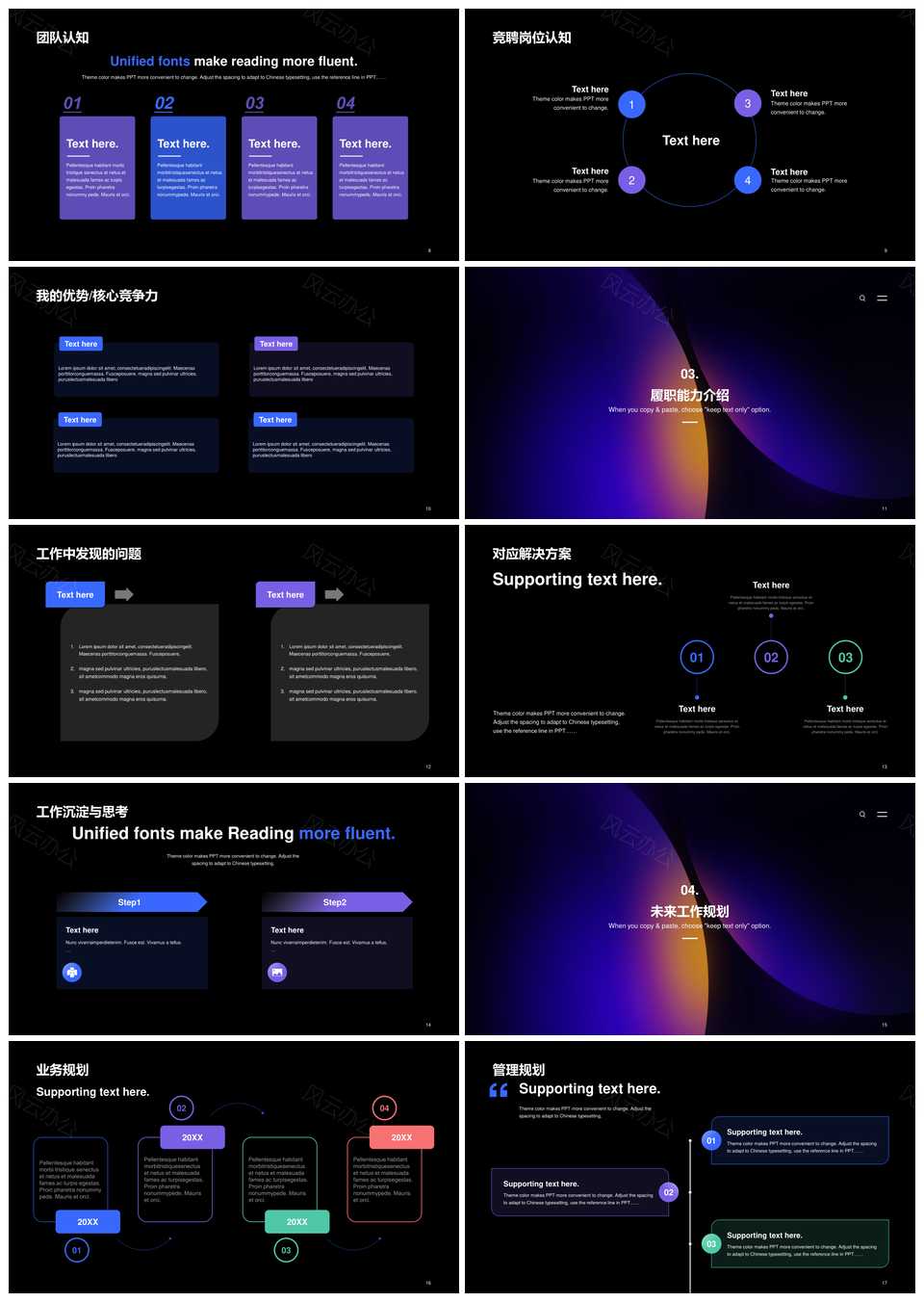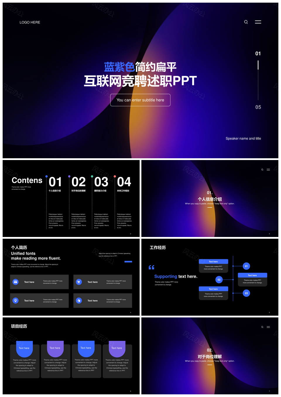 风云办公提供的蓝紫炫酷扁平互联网竞聘述职暗黑总结PPT模板,下载格式为pptx,一共19页,作品中文字及图均可以修改和编辑,图片更改请在作品中右键图片并更换,文字修改请直接点击文字进行修改。