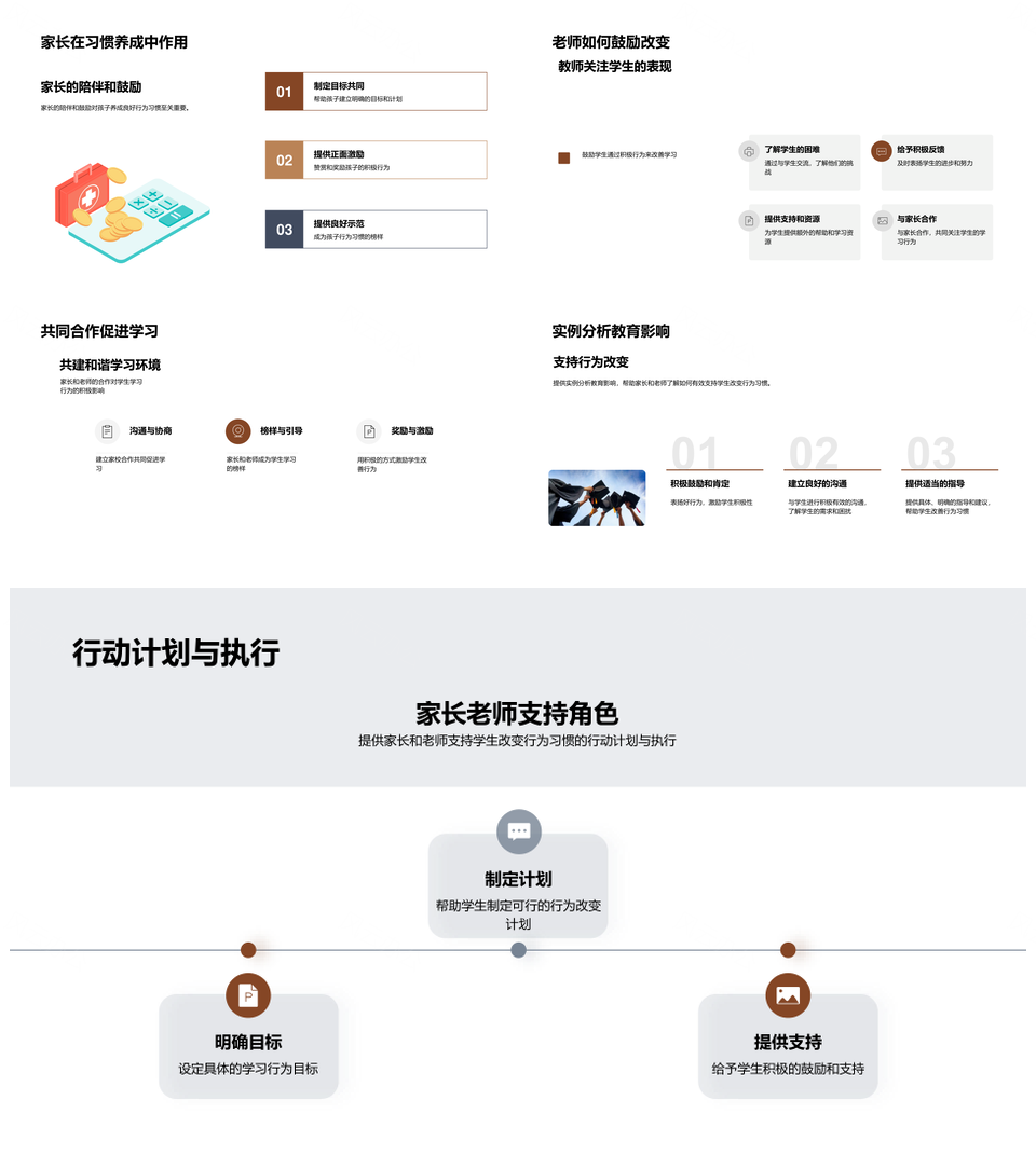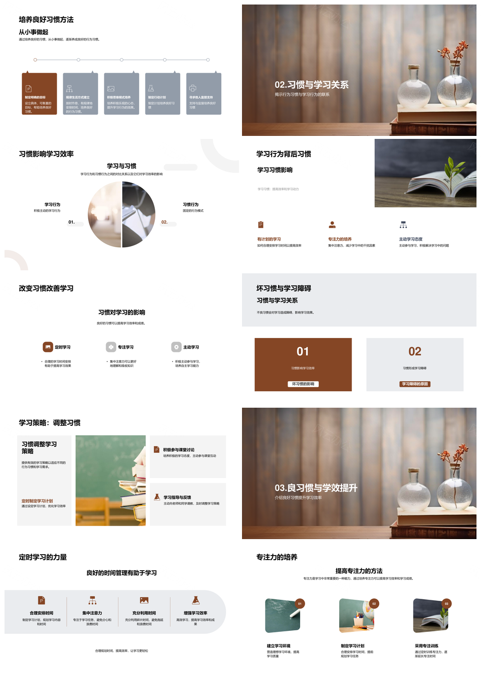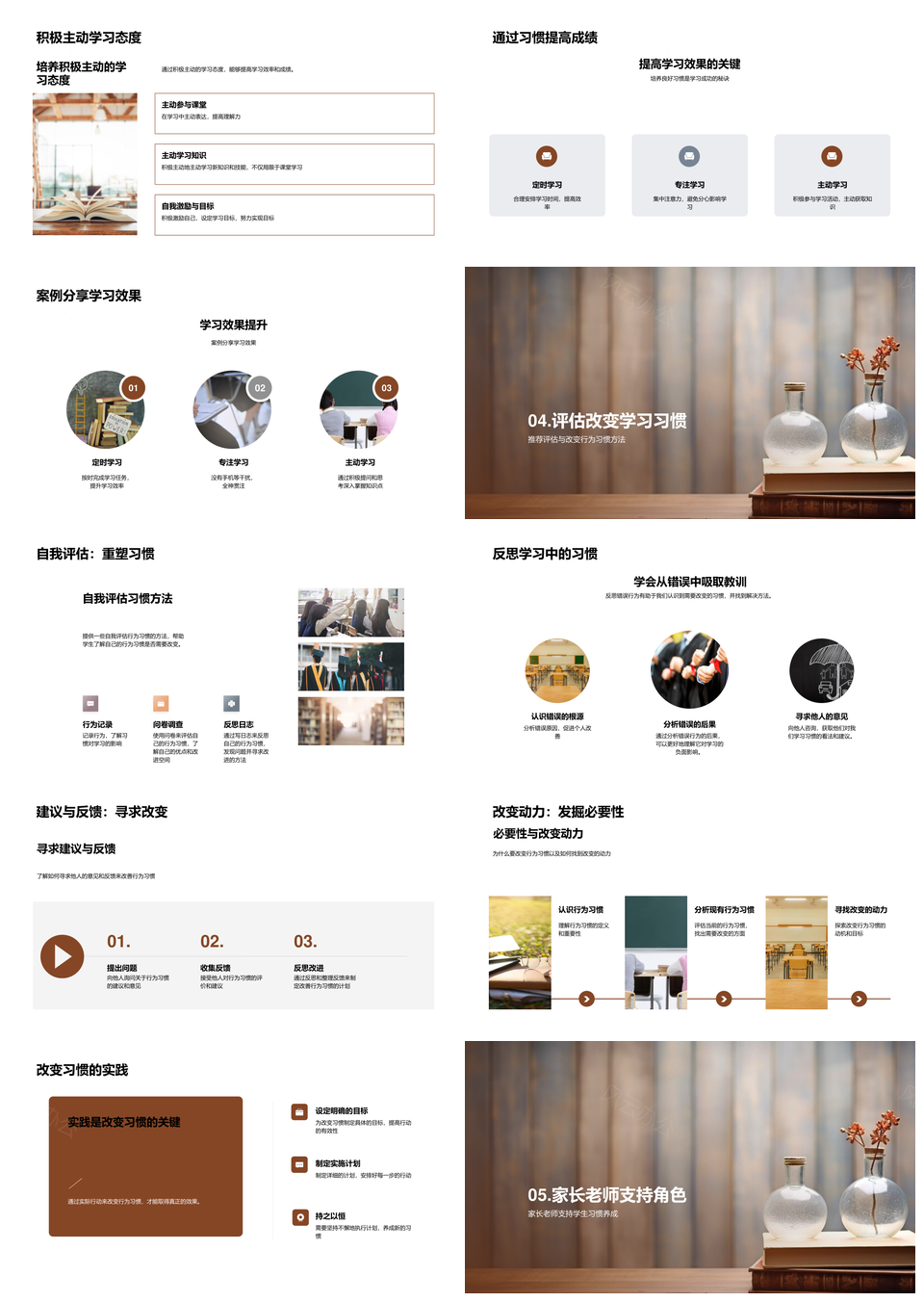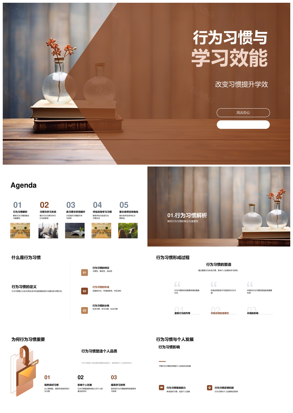 风云办公提供的行为习惯改变提升学习效能教育活动PPT模板,下载格式为pptx,一共33页,作品中文字及图均可以修改和编辑,图片更改请在作品中右键图片并更换,文字修改请直接点击文字进行修改。