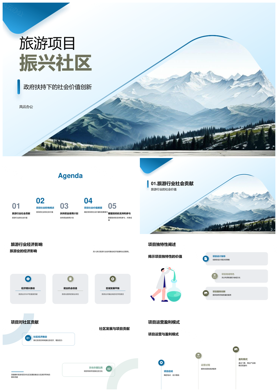 风云办公提供的政府扶持山景旅游项目助社区振兴PPT模板,下载格式为pptx,一共28页,作品中文字及图均可以修改和编辑,图片更改请在作品中右键图片并更换,文字修改请直接点击文字进行修改。