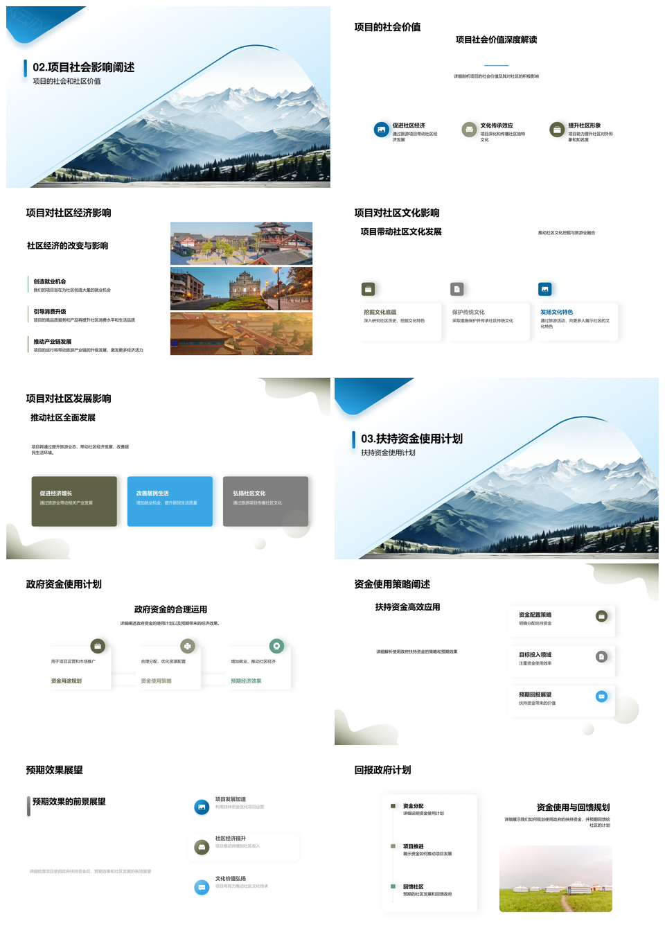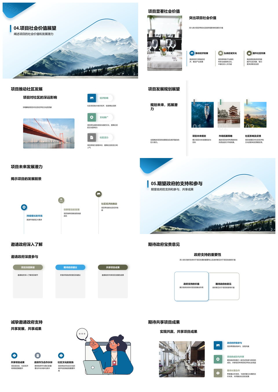 这是一张政府扶持山景旅游项目助社区振兴PPT模板,包含政府、扶持、山景、旅游项目、社区、振兴等主题内容,也可用作政府扶持山景旅游、政府扶持旅游项目、扶持山景旅游项目、政府扶持社区振兴、山景旅游社区振兴、政府扶持山景、扶持山景旅游、山景旅游项目、山景旅游社区、旅游社区振兴、政府扶持社区、项目社区振兴、政府扶持、山景旅游、社区振兴等PPT场景使用。