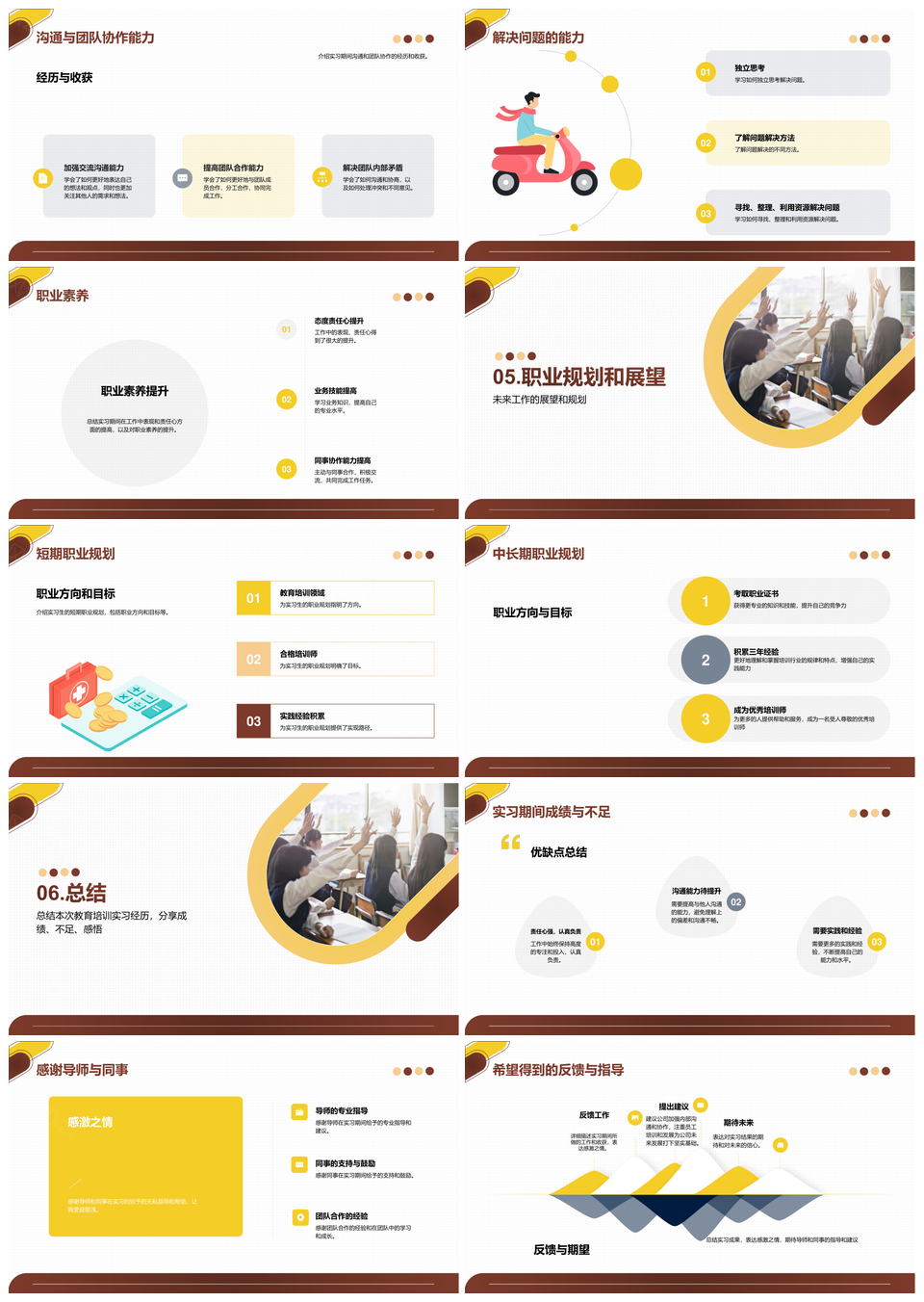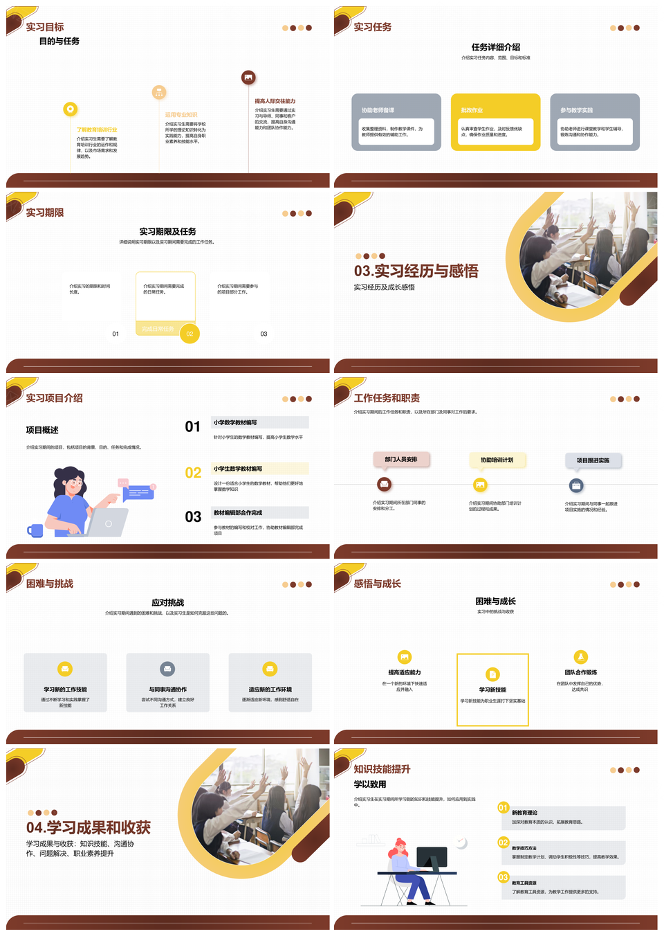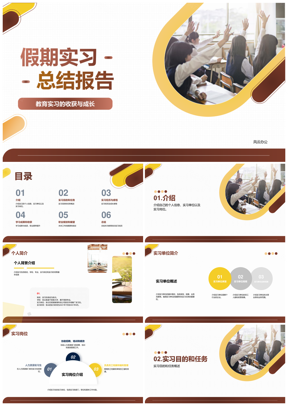 风云办公提供的黄棕简约假期实习总结报告PPT模板,下载格式为pptx,一共28页,作品中文字及图均可以修改和编辑,图片更改请在作品中右键图片并更换,文字修改请直接点击文字进行修改。