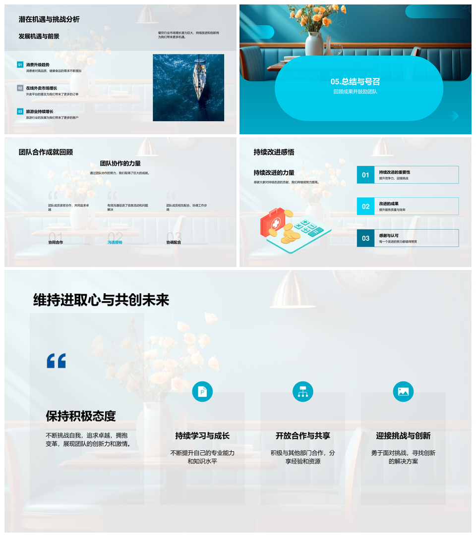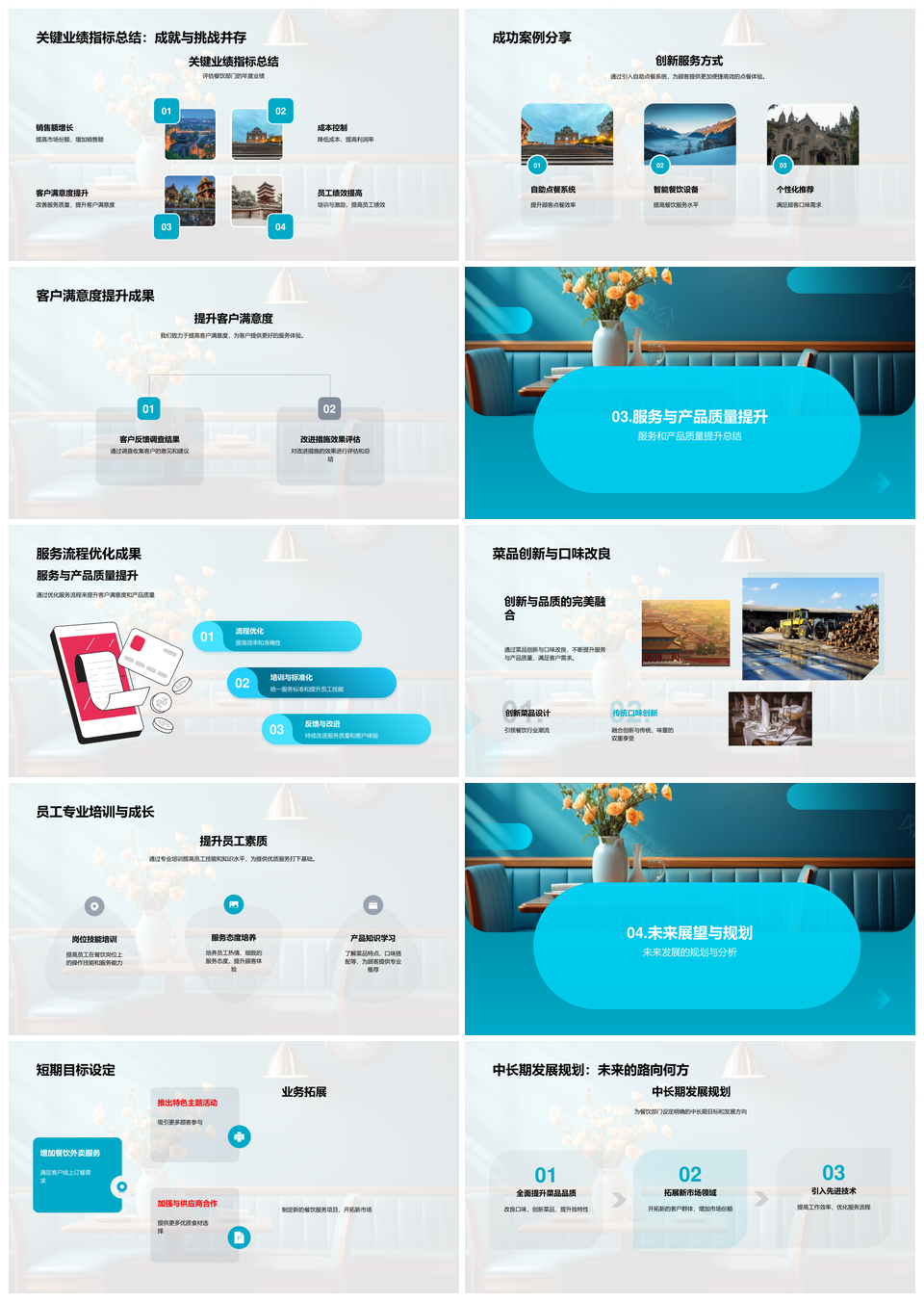 这是一张餐饮部年度业绩服务优化规划团队成就盘点PPT模板,包含餐饮部、年度、业绩、服务、优化、规划、团队、成就、盘点等主题内容,也可用作餐饮部年度业绩服务优化、年度业绩服务优化规划、业绩服务优化规划团队、服务优化规划团队成就、优化规划团队成就盘点、餐饮部年度业绩优化规划、餐饮部服务优化规划团队、年度服务优化规划团队成就、业绩优化规划团队成就盘点、餐饮部团队成就年度业绩、年度业绩服务规划团队、服务优化团队成就盘点、餐饮部服务团队成就、优化规划年度业绩、团队成就服务优化等PPT场景使用。 风云办公提供的餐饮部年度业绩服务优化规划团队成就盘点PPT模板,下载格式为pptx,一共23页,作品中文字及图均可以修改和编辑,图片更改请在作品中右键图片并更换,文字修改请直接点击文字进行修改。
