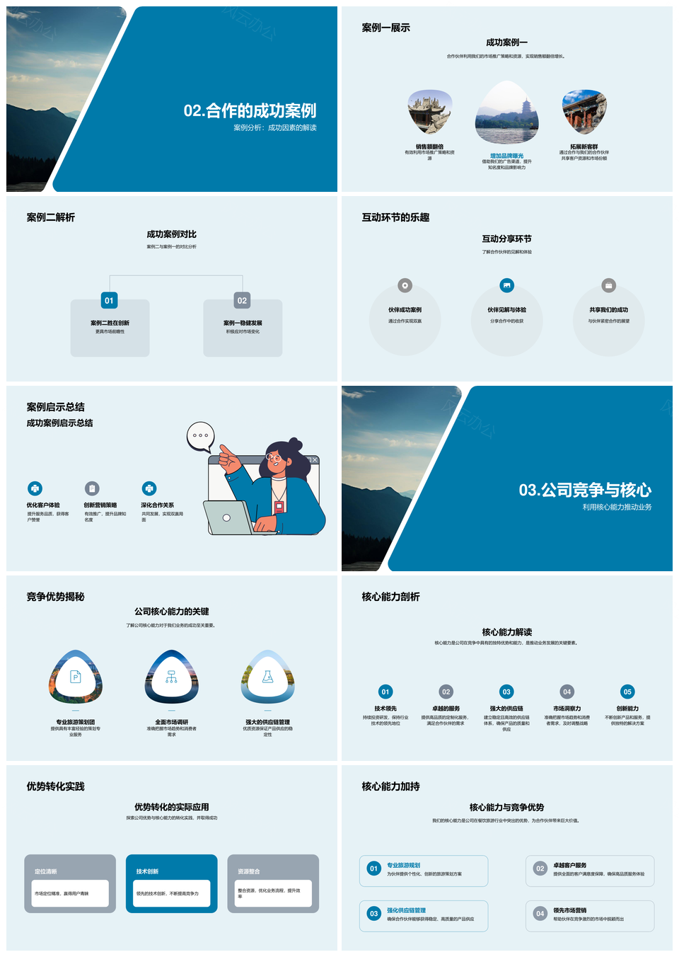 这是一张共创共赢战略合作伙伴核心能力成功案例PPT模板,包含共创、共赢、战略、合作伙伴、核心能力、成功、案例等主题内容,也可用作共创共赢战略合作伙伴、共赢战略合作伙伴核心能力、战略合作伙伴核心能力成功案例、共创共赢战略合作伙伴核心能力、战略合作伙伴核心能力成功案例、共创共赢战略、共赢战略合作伙伴、战略合作伙伴核心能力、合作伙伴核心能力成功案例、共创共赢、共赢战略、战略合作伙伴、合作伙伴核心能力、核心能力成功案例、合作伙伴成功案例等PPT场景使用。 风云办公提供的共创共赢战略合作伙伴核心能力成功案例PPT模板,下载格式为pptx,一共28页,作品中文字及图均可以修改和编辑,图片更改请在作品中右键图片并更换,文字修改请直接点击文字进行修改。
