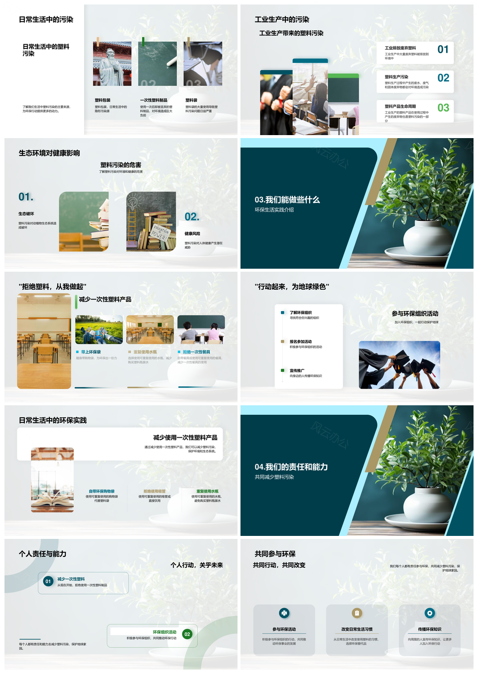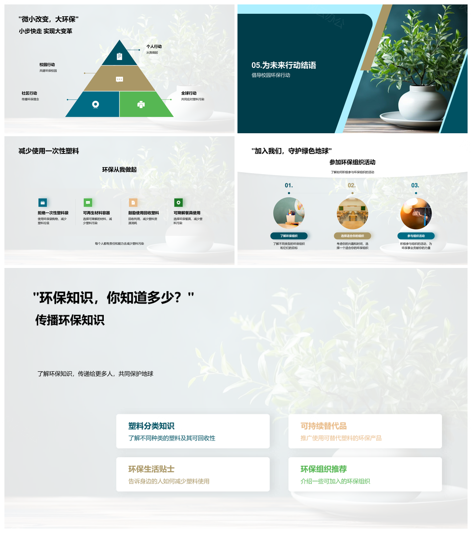 这是一张应对塑料污染推进环保生活教育减塑行动PPT模板,包含应对、塑料污染、推进、环保生活教育、减塑行动等主题内容,也可用作应对塑料污染推进、塑料污染推进环保、污染推进环保生活、推进环保生活教育、环保生活教育减塑、生活教育减塑行动、应对塑料污染、塑料污染推进、污染推进环保、推进环保生活、环保生活教育、生活教育减塑、教育减塑行动、应对塑料、塑料污染、污染推进、推进环保、环保生活、生活教育、教育减塑、减塑行动等PPT场景使用。 风云办公提供的应对塑料污染推进环保生活教育减塑行动PPT模板,下载格式为pptx,一共23页,作品中文字及图均可以修改和编辑,图片更改请在作品中右键图片并更换,文字修改请直接点击文字进行修改。