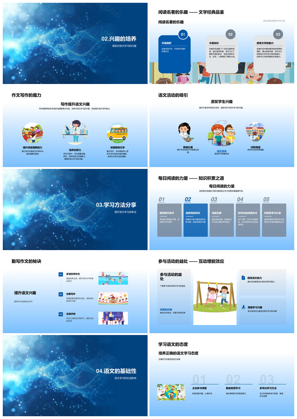 这是一张四年级语文阅读写作能力与文化素养培养PPT模板,包含四年级、语文、阅读写作能力、文化素养、培养等主题内容,也可用作四年级语文阅读写作、语文阅读写作能力、四年级语文阅读、语文阅读写作、阅读写作能力、文化素养培养、写作能力培养、四年级语文、语文阅读、阅读写作、写作能力、能力培养、文化素养、素养培养、阅读能力等PPT场景使用。 风云办公提供的四年级语文阅读写作能力与文化素养培养PPT模板,下载格式为pptx,一共24页,作品中文字及图均可以修改和编辑,图片更改请在作品中右键图片并更换,文字修改请直接点击文字进行修改。