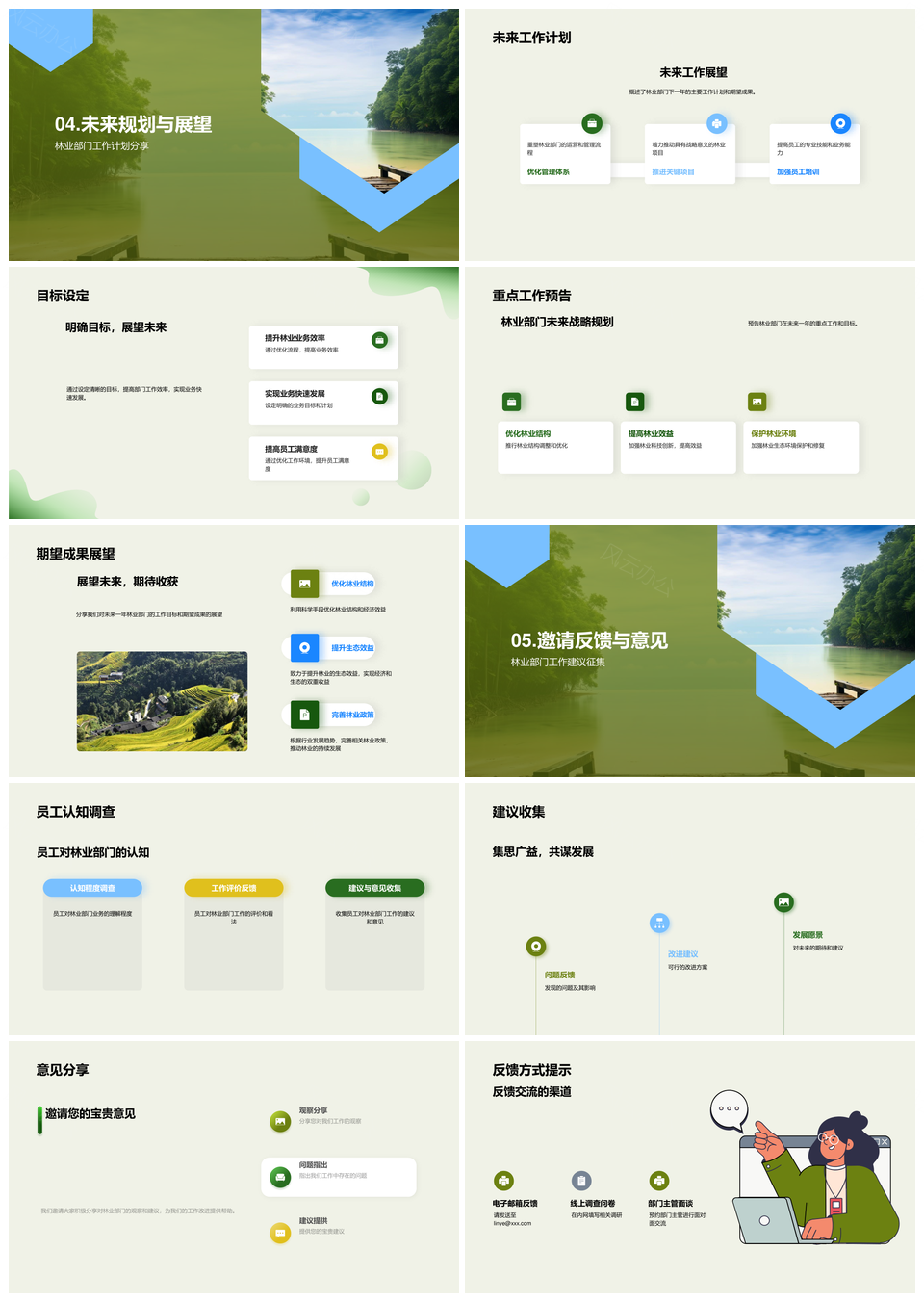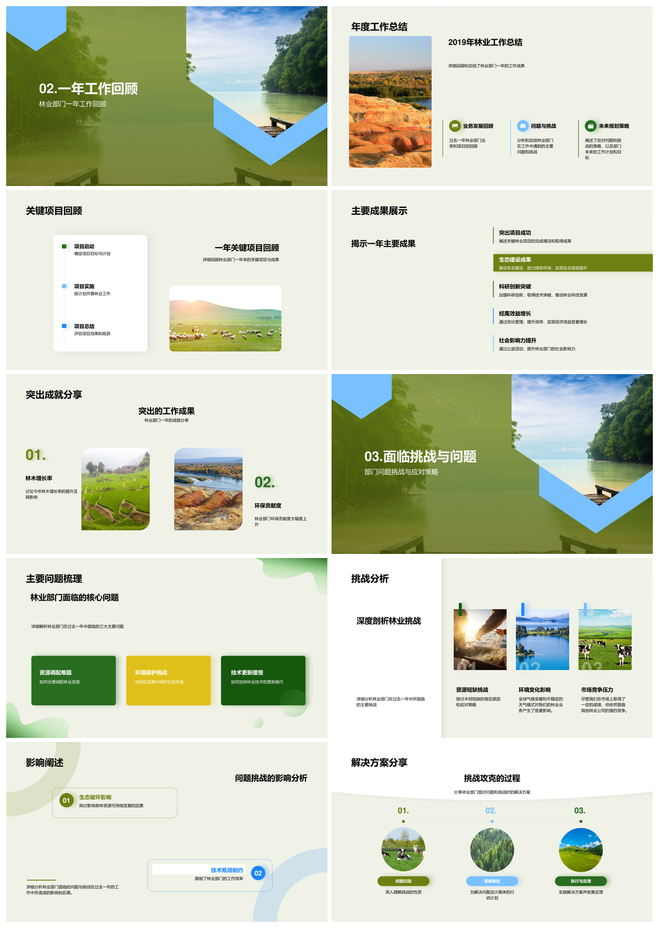 这是一张林业部门绿色前行年度工作成就挑战策略PPT模板,包含林业部门、绿色前行、年度工作、成就、挑战、策略等主题内容,也可用作林业部门绿色前行年度工作成就、绿色前行年度工作成就挑战、年度工作成就挑战策略、林业部门年度工作挑战、绿色前行成就挑战、年度工作挑战策略、林业部门挑战策略、林业部门绿色前行、绿色前行年度工作、年度工作成就、成就挑战、挑战策略、林业部门策略、绿色前行策略、年度工作策略等PPT场景使用。 风云办公提供的林业部门绿色前行年度工作成就挑战策略PPT模板,下载格式为pptx,一共28页,作品中文字及图均可以修改和编辑,图片更改请在作品中右键图片并更换,文字修改请直接点击文字进行修改。