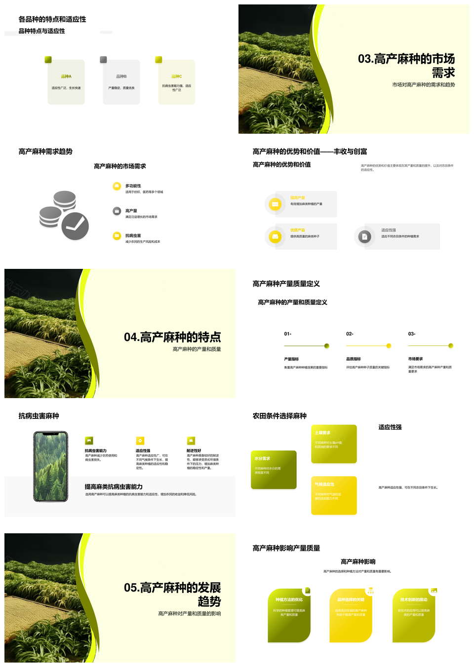 风云办公提供的高产麻种农展种植指南供应商PPT模板,下载格式为pptx,一共23页,作品中文字及图均可以修改和编辑,图片更改请在作品中右键图片并更换,文字修改请直接点击文字进行修改。
