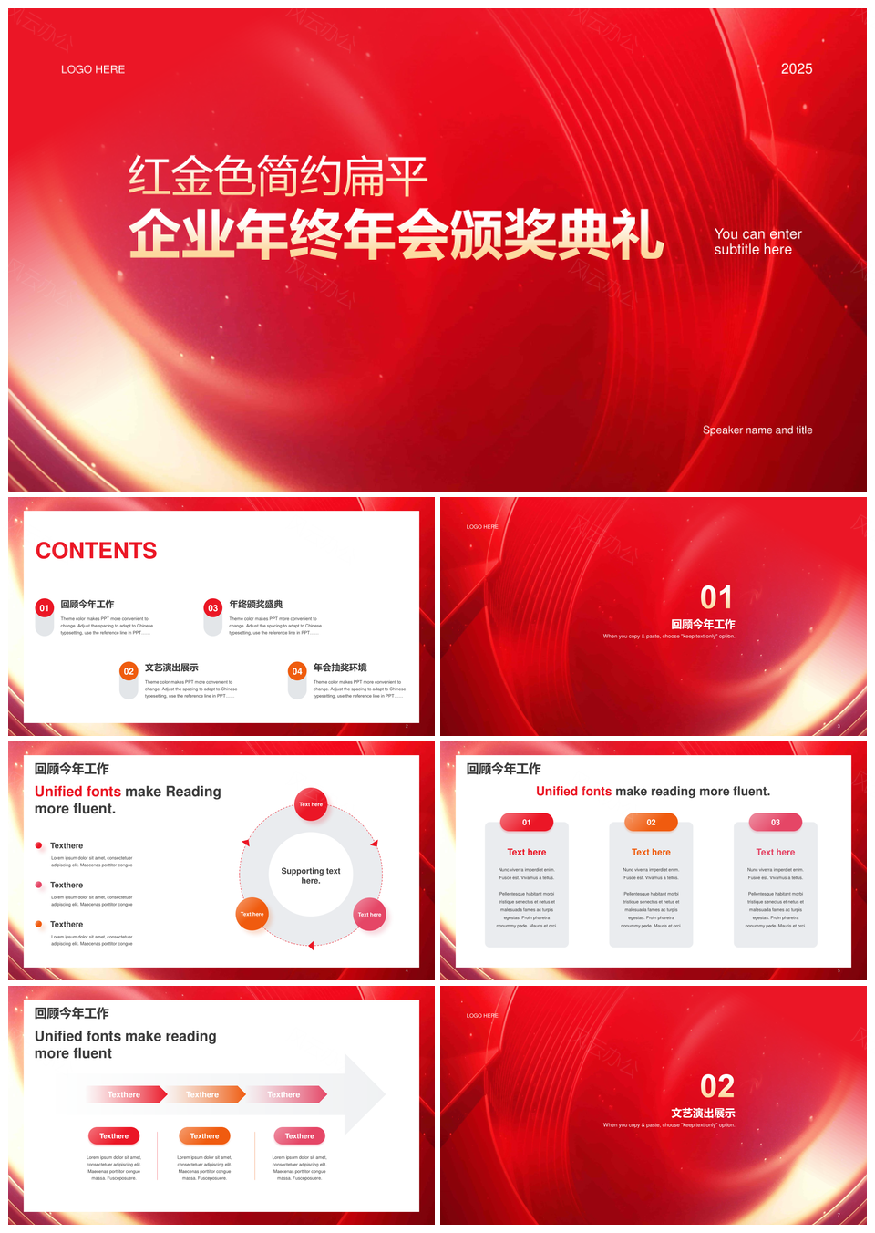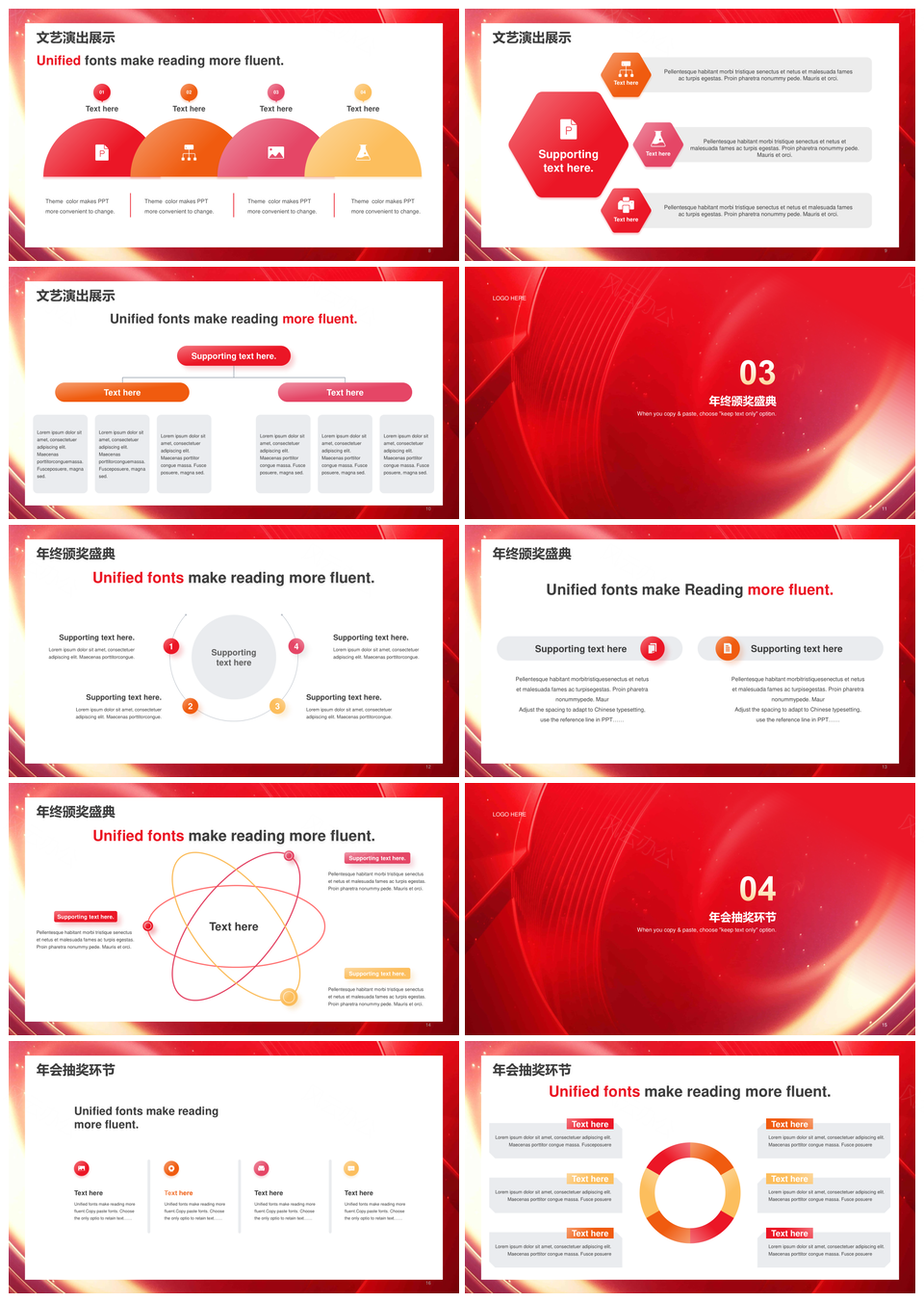 风云办公提供的红色简约扁平年会颁奖典礼工作总结PPT模板,下载格式为pptx,一共18页,作品中文字及图均可以修改和编辑,图片更改请在作品中右键图片并更换,文字修改请直接点击文字进行修改。
