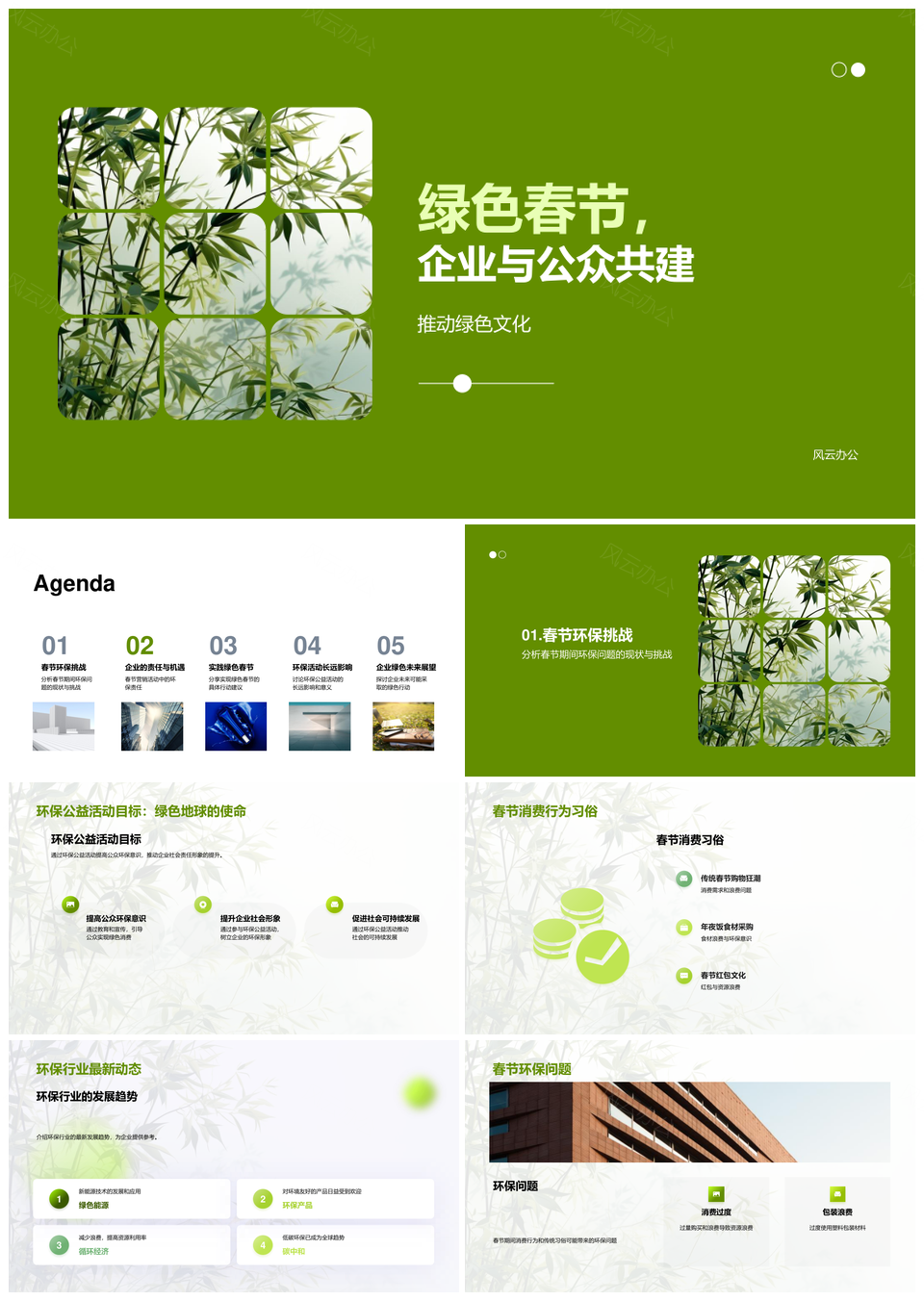 风云办公提供的企业公众共建绿色春节践行环保责任PPT模板,下载格式为pptx,一共24页,作品中文字及图均可以修改和编辑,图片更改请在作品中右键图片并更换,文字修改请直接点击文字进行修改。