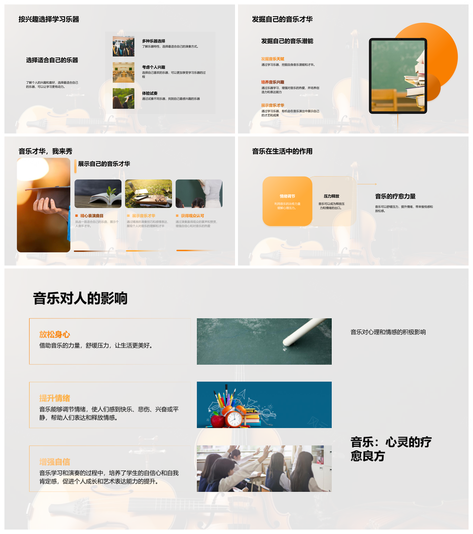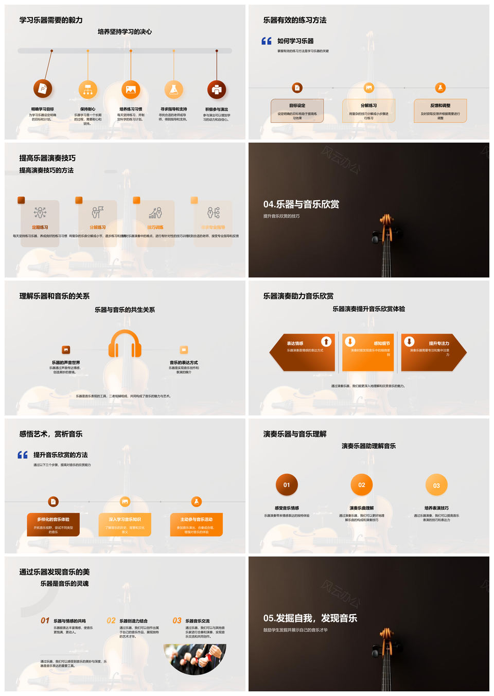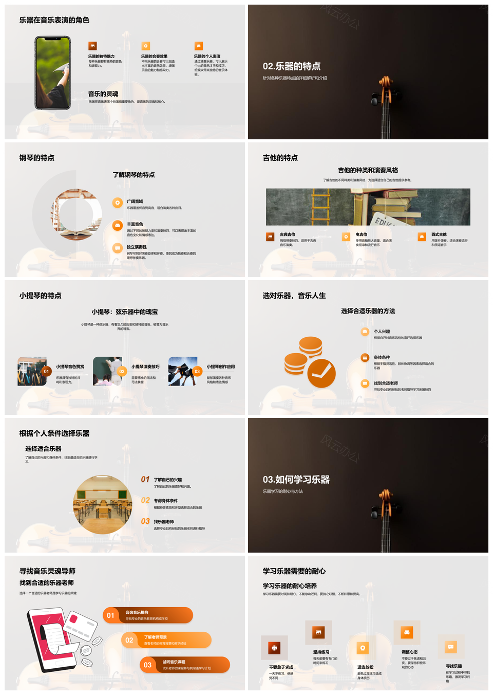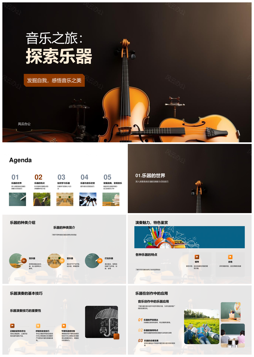 风云办公提供的音乐之旅乐器演奏创作表演探索PPT模板,下载格式为pptx,一共33页,作品中文字及图均可以修改和编辑,图片更改请在作品中右键图片并更换,文字修改请直接点击文字进行修改。