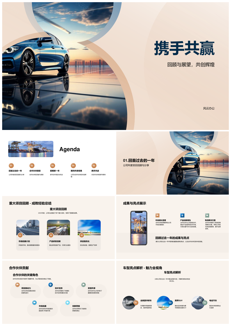 风云办公提供的合作伙伴年会汽车业总裁表彰成功案例PPT模板,下载格式为pptx,一共28页,作品中文字及图均可以修改和编辑,图片更改请在作品中右键图片并更换,文字修改请直接点击文字进行修改。