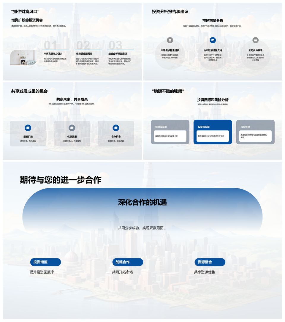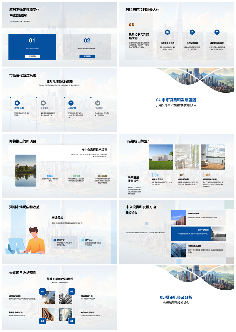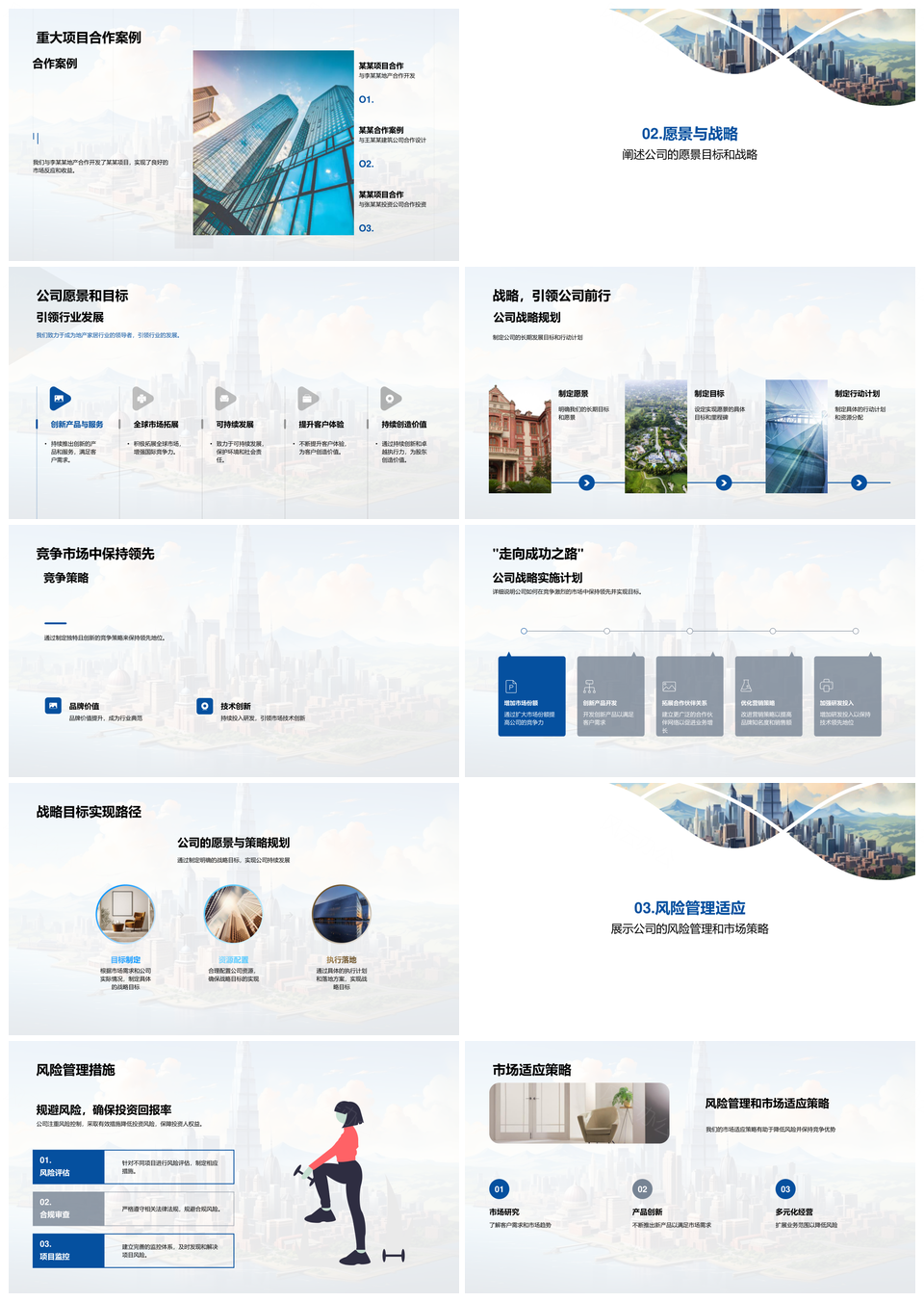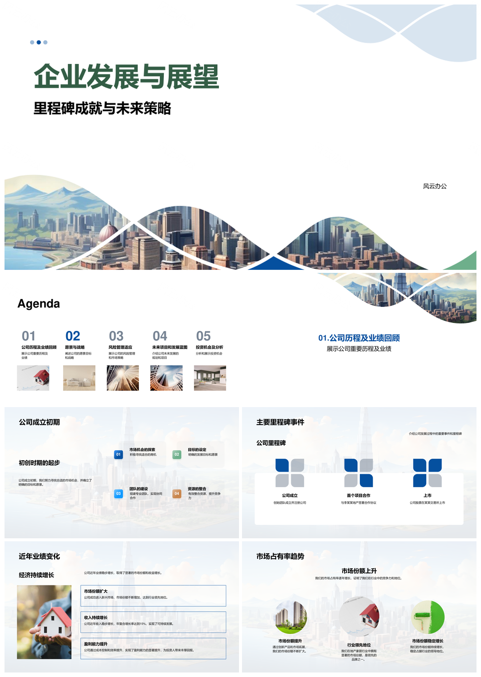 这是一张企业发展展望战略风险管理投资者新项目摩天大楼PPT模板,包含企业发展、展望、战略、风险、管理、投资者、新项目、摩天大楼等主题内容,也可用作企业发展展望战略风险、发展展望战略风险管理、展望战略风险管理投资者、战略风险管理投资者新项目、风险管理投资者新项目摩天大楼、企业发展展望战略、发展展望战略风险、展望战略风险管理、战略风险管理投资者、风险管理投资者新项目、企业管理投资者新项目、企业发展展望、发展展望战略、展望战略风险、战略风险管理等PPT场景使用。 风云办公提供的企业发展展望战略风险管理投资者新项目摩天大楼PPT模板,下载格式为pptx,一共33页,作品中文字及图均可以修改和编辑,图片更改请在作品中右键图片并更换,文字修改请直接点击文字进行修改。