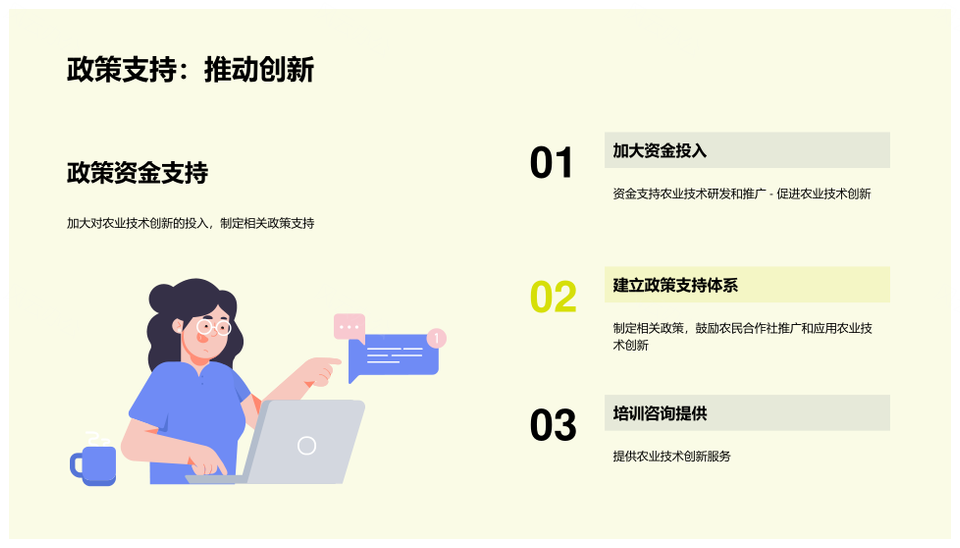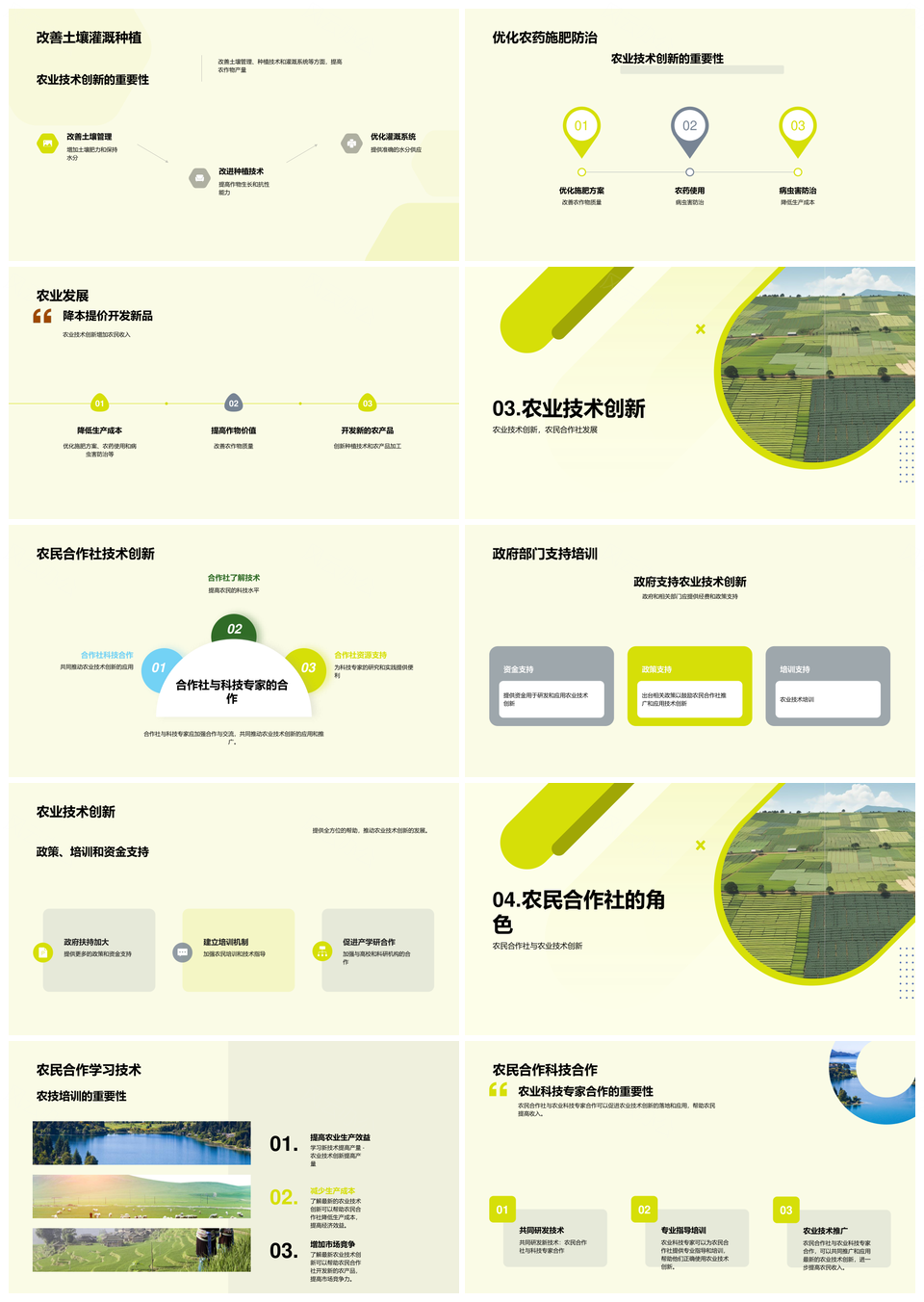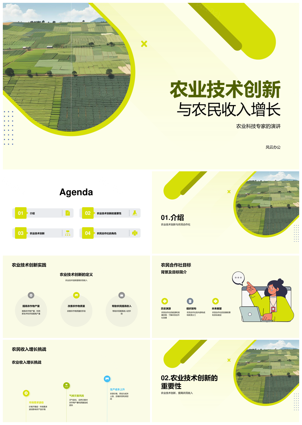 风云办公提供的农民增收农业技术创新与种植管理PPT模板,下载格式为pptx,一共19页,作品中文字及图均可以修改和编辑,图片更改请在作品中右键图片并更换,文字修改请直接点击文字进行修改。