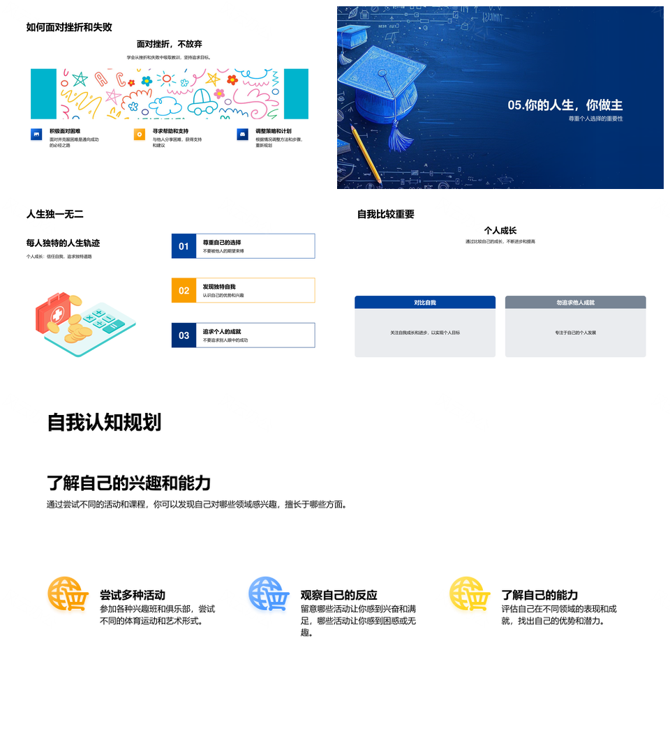 这是一张六年级学生人生职业规划家长会教育活动PPT模板,包含六年级、学生、人生、职业、规划、家长会、教育、活动等主题内容,也可用作六年级学生人生职业规划家长会教育活动、六年级学生职业规划家长会教育活动、学生人生职业规划家长会教育、人生职业规划家长会教育活动、职业规划家长会教育活动、六年级学生人生职业规划、学生人生职业规划家长会、人生职业规划家长会、六年级学生家长会教育、学生职业规划教育活动、职业规划家长会教育、家长会教育活动、六年级职业规划教育、学生人生职业规划、家长会职业规划、职业规划教育、六年级家长会、学生职业规划、家长会教育、人生规划等PPT场景使用。 风云办公提供的六年级学生人生职业规划家长会教育活动PPT模板,下载格式为pptx,一共23页,作品中文字及图均可以修改和编辑,图片更改请在作品中右键图片并更换,文字修改请直接点击文字进行修改。