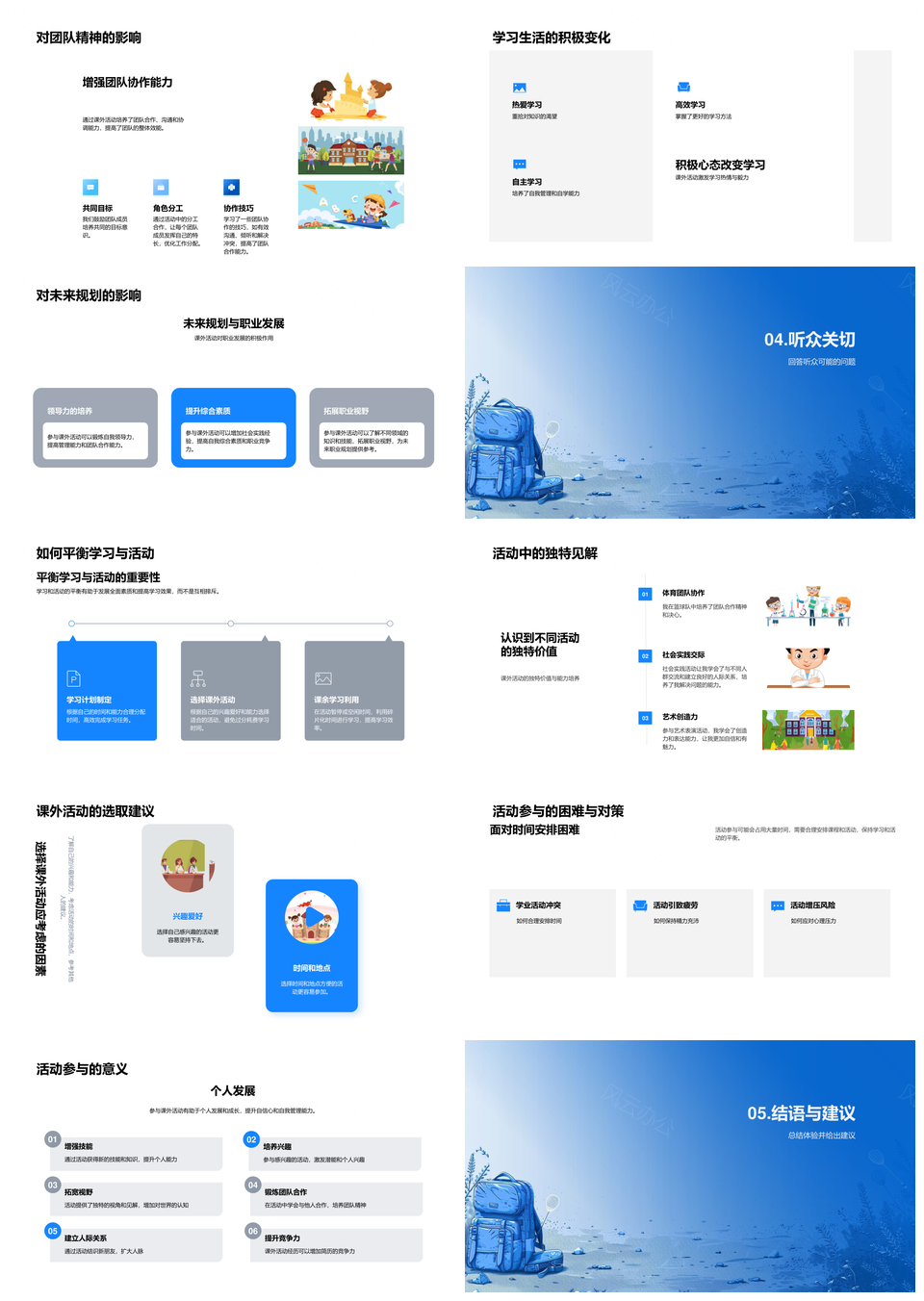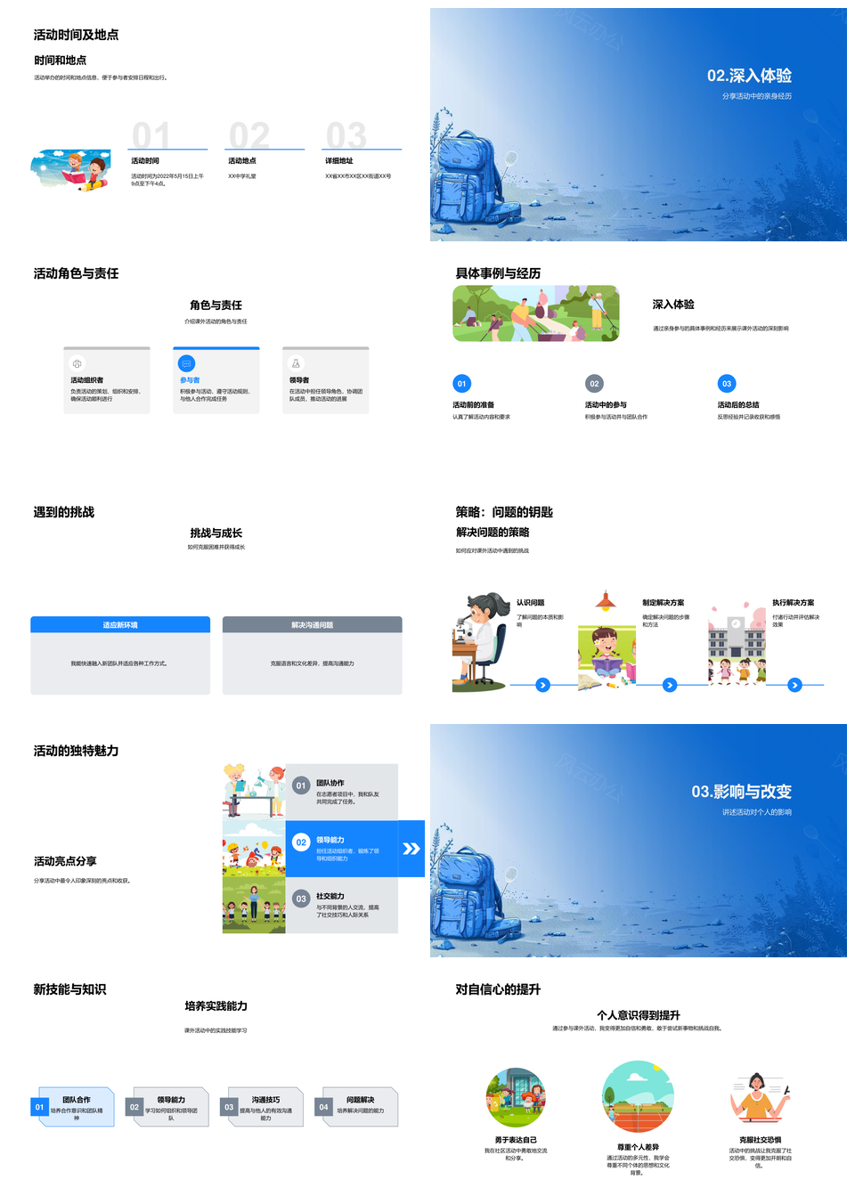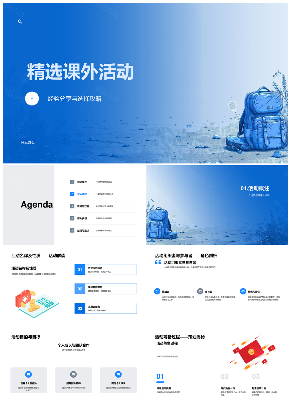 风云办公提供的课外活动精选经验技能自信提升攻略PPT模板,下载格式为pptx,一共33页,作品中文字及图均可以修改和编辑,图片更改请在作品中右键图片并更换,文字修改请直接点击文字进行修改。