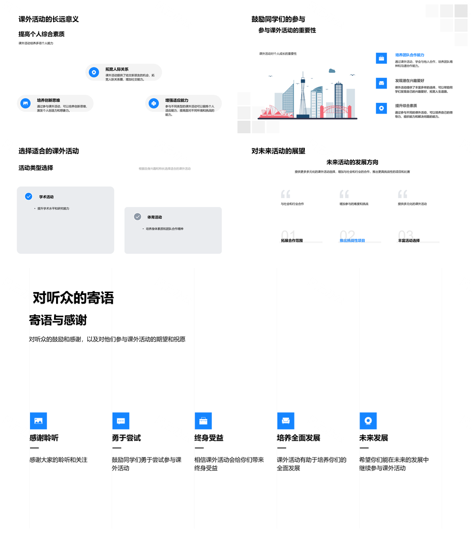 这是一张课外活动精选经验技能自信提升攻略PPT模板,包含课外活动、精选、经验、技能、自信、提升、攻略等主题内容,也可用作课外活动精选经验技能、精选经验技能自信、经验技能自信提升、技能自信提升攻略、课外活动精选经验、精选经验技能、经验技能自信、技能自信提升、自信提升攻略、课外活动精选、精选经验、经验技能、技能自信、自信提升、提升攻略等PPT场景使用。