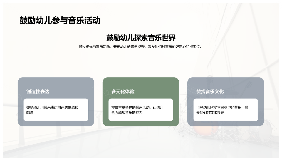 这是一张幼儿园音乐兴趣情感认知乐器促语言教学PPT模板,包含幼儿园、音乐、兴趣、情感、认知、乐器、语言、教学等主题内容,也可用作幼儿园音乐兴趣情感认知乐器、音乐兴趣情感认知乐器、兴趣情感认知乐器促语言、幼儿园音乐兴趣情感认知、幼儿园音乐兴趣情感、音乐兴趣情感认知乐器、音乐兴趣情感认知、情感认知乐器促语言、幼儿园音乐兴趣、兴趣情感认知乐器、幼儿园情感认知乐器、音乐情感认知乐器、兴趣认知乐器促语言、幼儿园音乐兴趣情感、音乐兴趣情感、兴趣情感认知、情感认知乐器、幼儿园音乐、音乐兴趣、兴趣情感、情感认知、认知乐器、乐器促语言、促语言教学、语言教学、幼儿园促语言、音乐促语言、兴趣促语言等PPT场景使用。 风云办公提供的幼儿园音乐兴趣情感认知乐器促语言教学PPT模板,下载格式为pptx,一共29页,作品中文字及图均可以修改和编辑,图片更改请在作品中右键图片并更换,文字修改请直接点击文字进行修改。