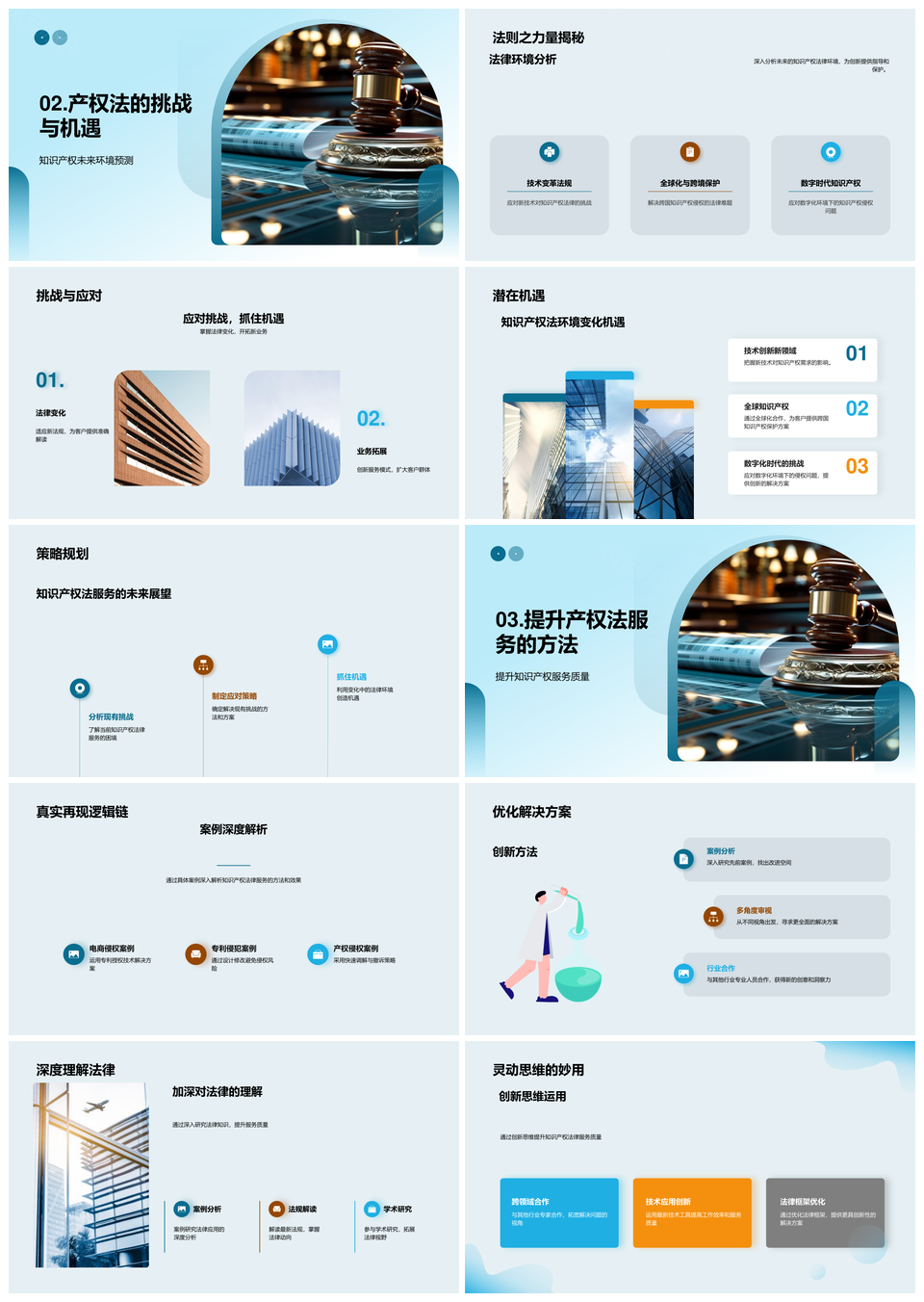 风云办公提供的创新思维知识产权法挑战机遇律师策略PPT模板,下载格式为pptx,一共28页,作品中文字及图均可以修改和编辑,图片更改请在作品中右键图片并更换,文字修改请直接点击文字进行修改。