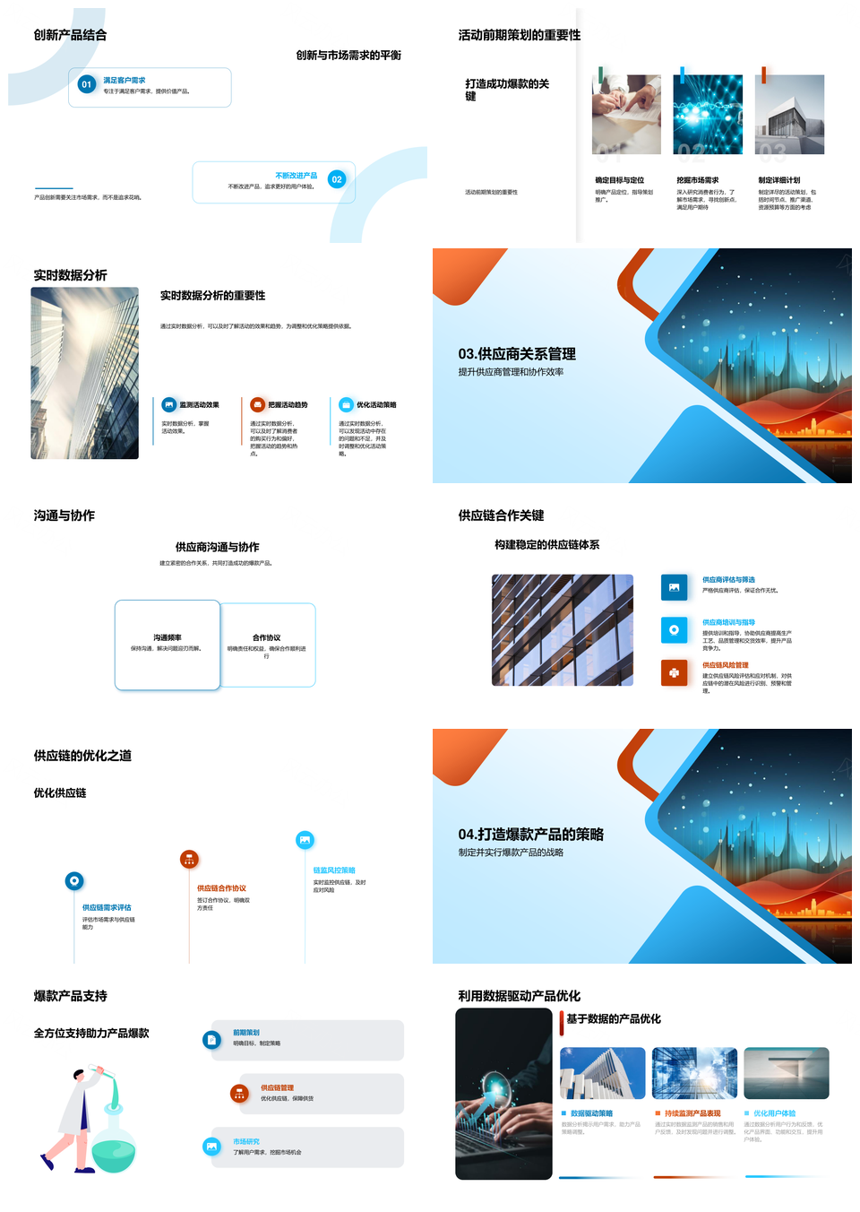 这是一张爆款运营策略市场供应链优化电商活动趋势案例解析PPT模板,包含爆款、运营策略、市场、供应链、优化、电商、活动、趋势、案例、解析等主题内容,也可用作爆款运营策略市场供应链优化、运营策略市场供应链优化电商活动、市场供应链优化电商活动趋势、供应链优化电商活动趋势案例解析、爆款运营策略市场供应链、运营策略市场供应链优化、市场供应链优化电商活动、供应链优化电商活动趋势、电商活动趋势案例解析、爆款运营策略市场、运营策略市场供应链、市场供应链优化电商、供应链优化电商活动、电商活动趋势案例、趋势案例解析供应链等PPT场景使用。 风云办公提供的爆款运营策略市场供应链优化电商活动趋势案例解析PPT模板,下载格式为pptx,一共23页,作品中文字及图均可以修改和编辑,图片更改请在作品中右键图片并更换,文字修改请直接点击文字进行修改。