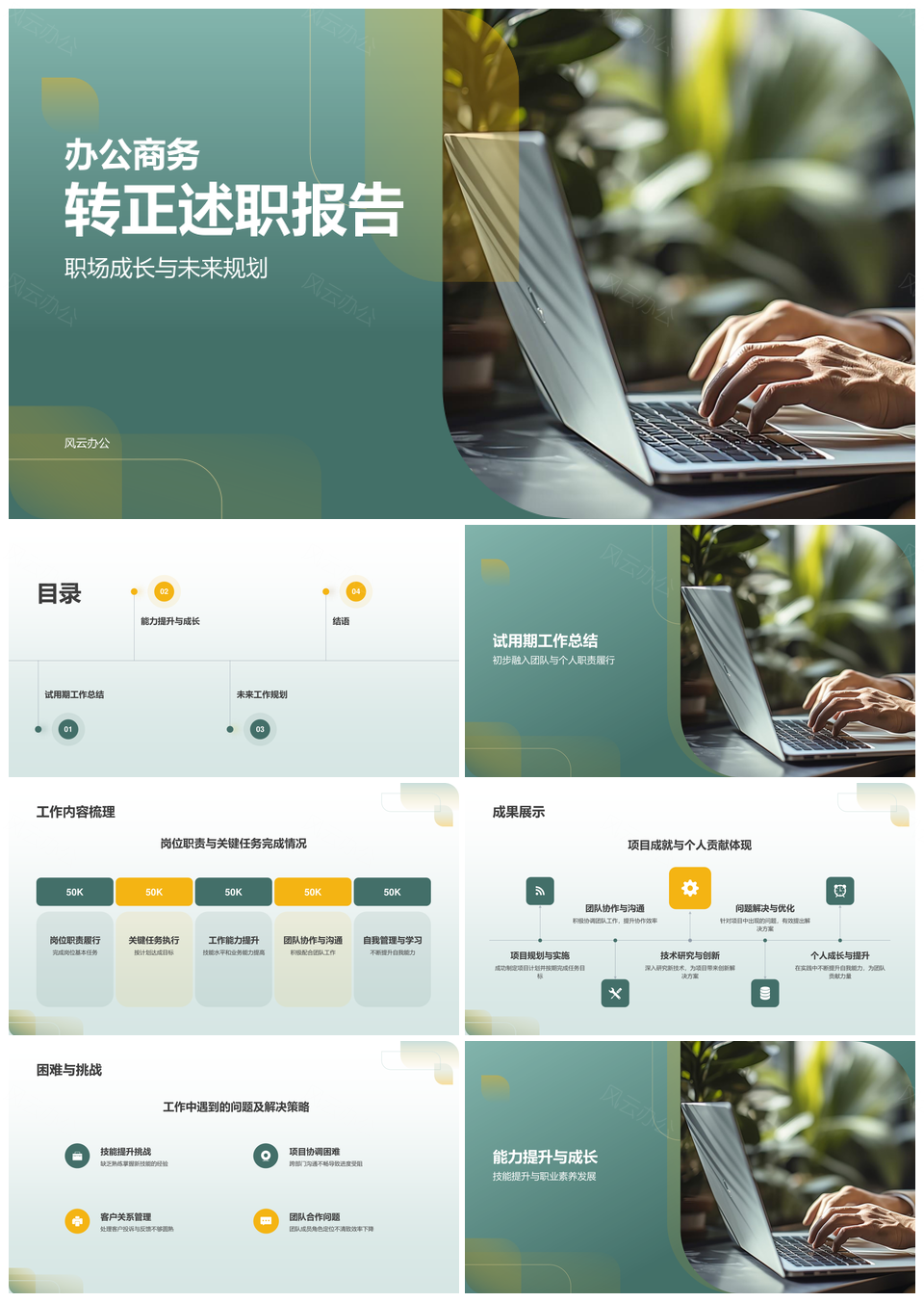 风云办公提供的现代职场蓝绿商务转正述职报告PPT模板,下载格式为pptx,一共20页,作品中文字及图均可以修改和编辑,图片更改请在作品中右键图片并更换,文字修改请直接点击文字进行修改。