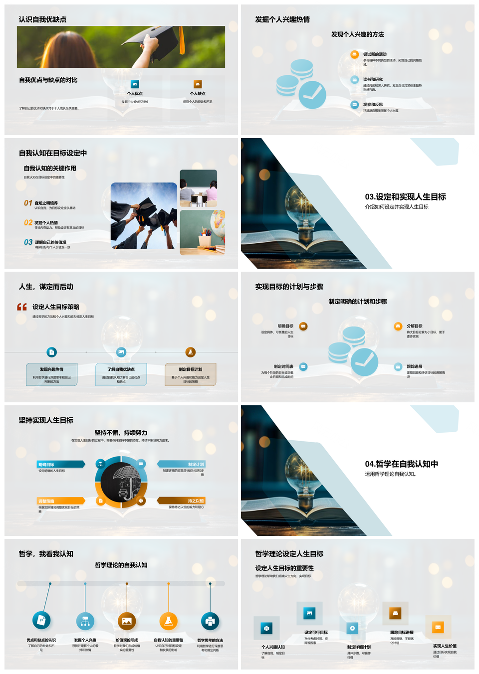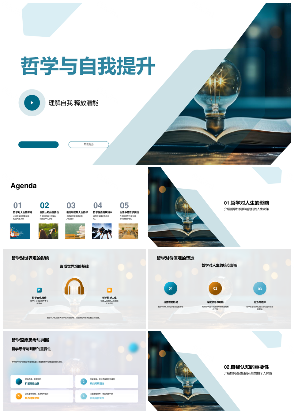 风云办公提供的哲学深度思考启自我提升与人生目标PPT模板,下载格式为pptx,一共23页,作品中文字及图均可以修改和编辑,图片更改请在作品中右键图片并更换,文字修改请直接点击文字进行修改。