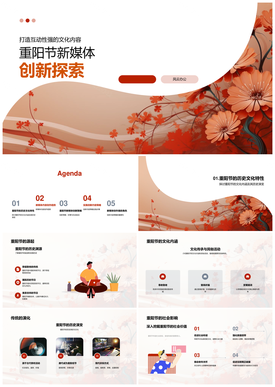 风云办公提供的重阳节新媒体菊花互动内容创新策划PPT模板,下载格式为pptx,一共30页,作品中文字及图均可以修改和编辑,图片更改请在作品中右键图片并更换,文字修改请直接点击文字进行修改。