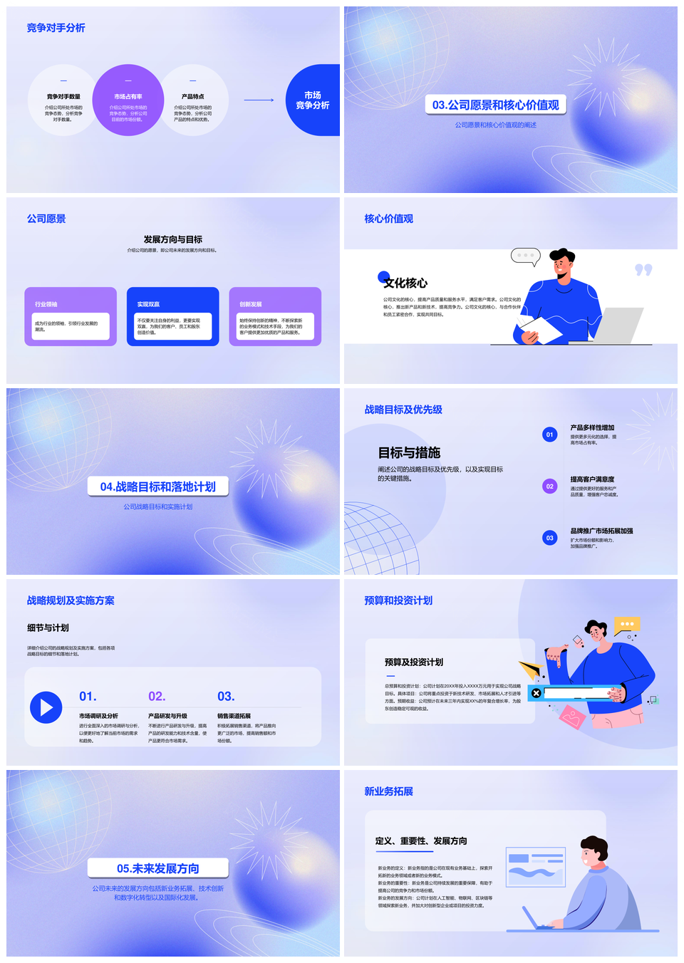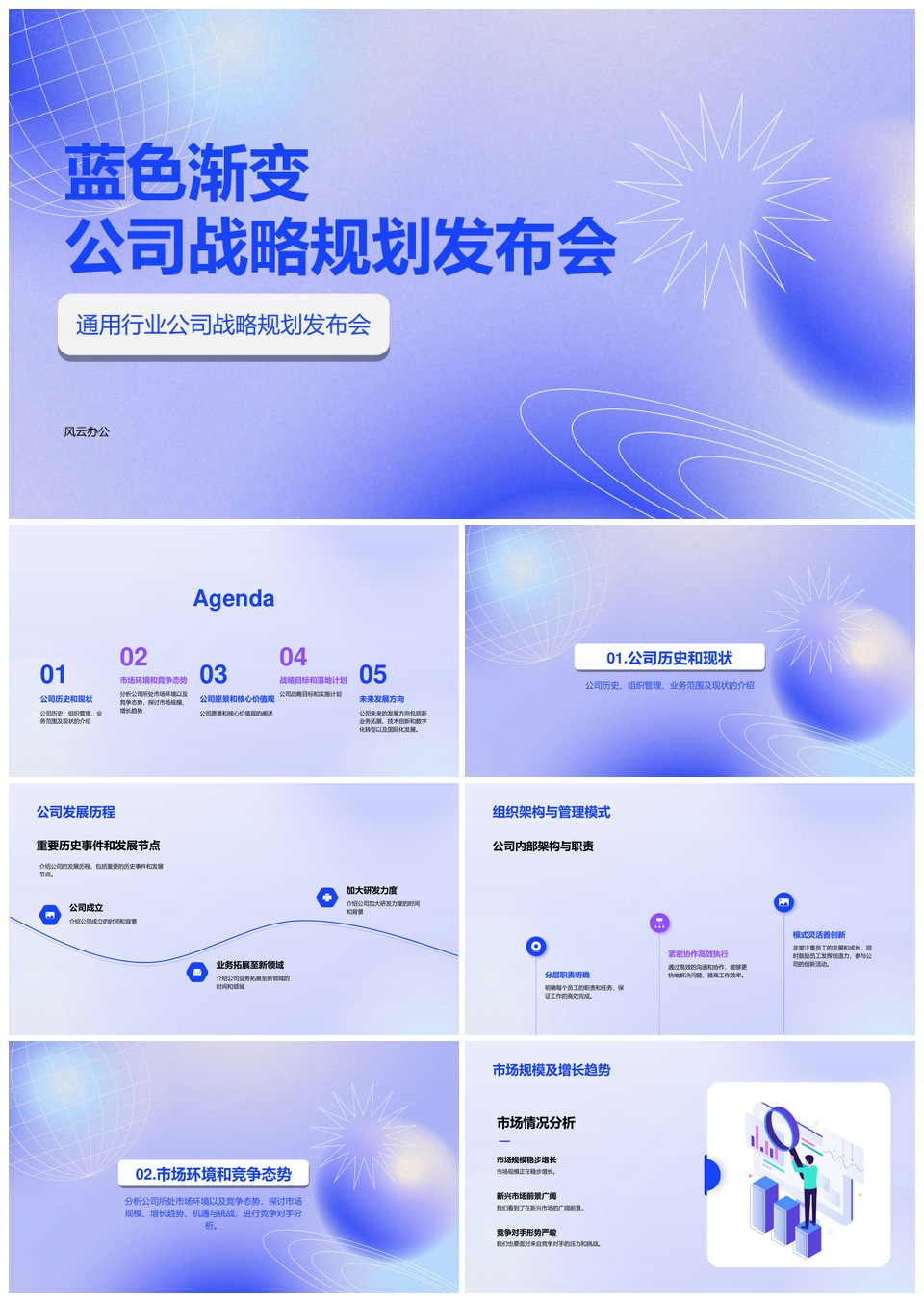 风云办公提供的蓝色渐变公司战略规划发布会PPT模板,下载格式为pptx,一共20页,作品中文字及图均可以修改和编辑,图片更改请在作品中右键图片并更换,文字修改请直接点击文字进行修改。
