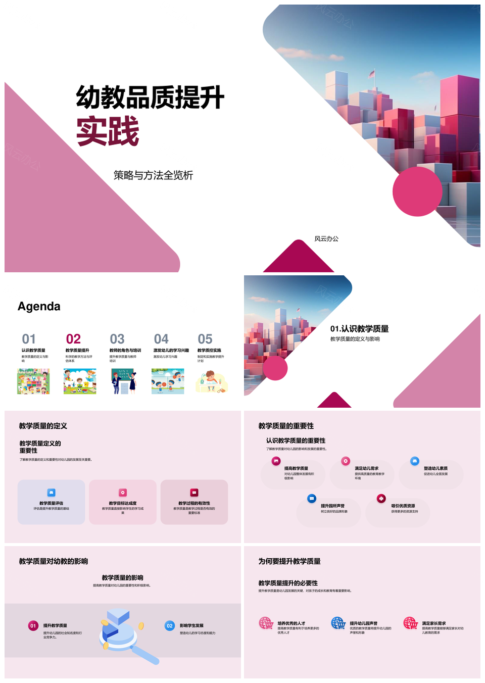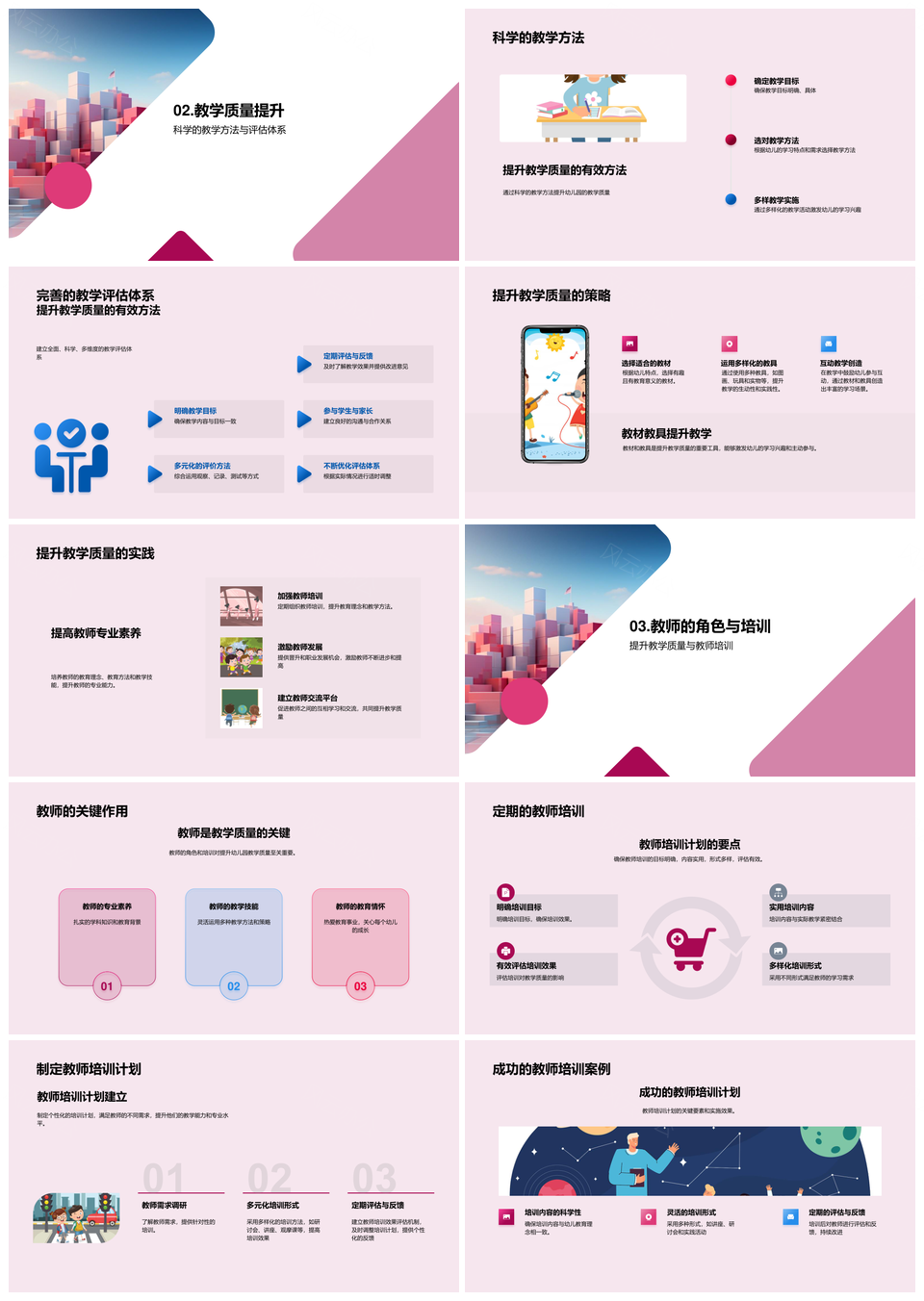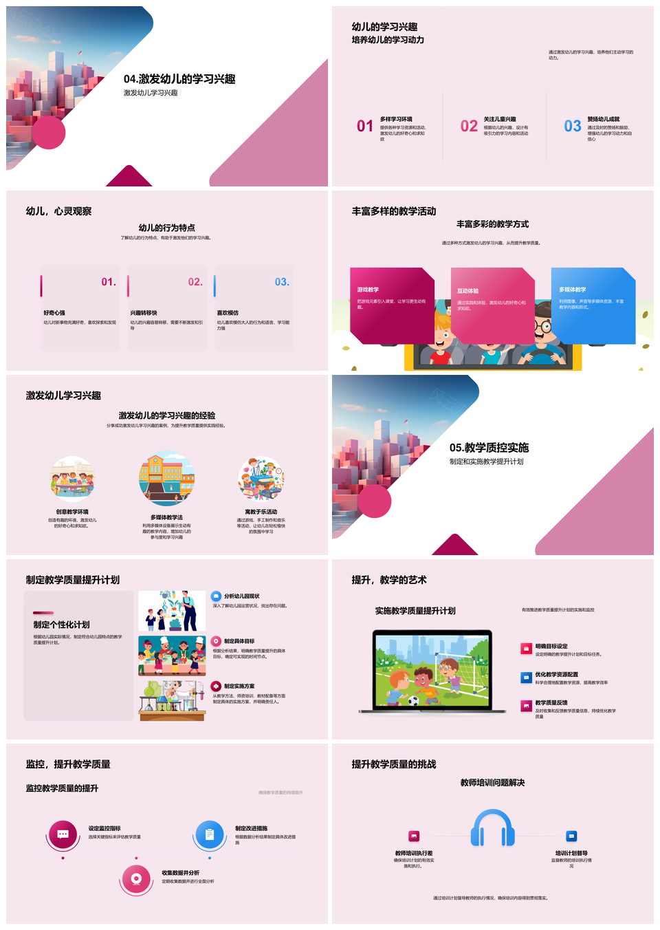 本模板专为幼教行业深度设计,聚焦师训提质与教学管理效能提升。内容涵盖课程体系构建、教法创新路径、动态评估工具三大模块,内置积木教学法的实践案例拆解及激趣活动设计流程图。支持园长快速梳理教研规划,教师一键导出教材分析报告;提供科学启蒙专题页,以波粒二象性、激光实验等浅显案例搭建儿童认知阶梯。PPT采用模块化版式,包含12种教学场景适配图表、8组可编辑的课程逻辑框架模板,兼顾理论阐释与实践操作指引,支持从日常教研到成果汇报的完整闭环,有效降低沟通成本。