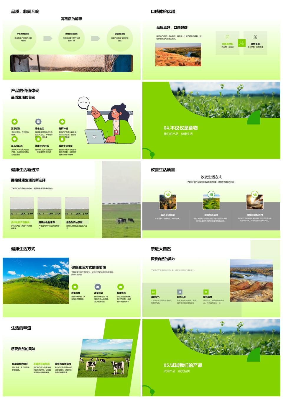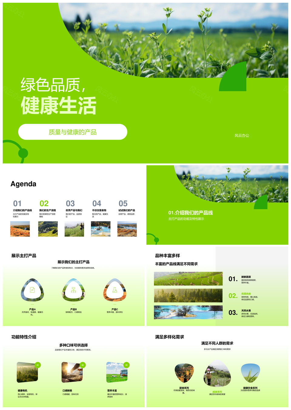 风云办公提供的绿色田野生态生产健康生活精品PPT模板,下载格式为pptx,一共33页,作品中文字及图均可以修改和编辑,图片更改请在作品中右键图片并更换,文字修改请直接点击文字进行修改。