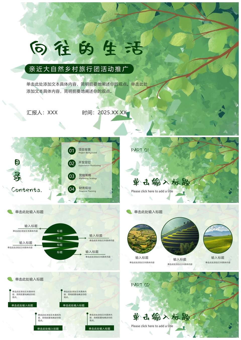 2025绿色新农村简约插画乡村旅游家乡活动推广PPT模板
