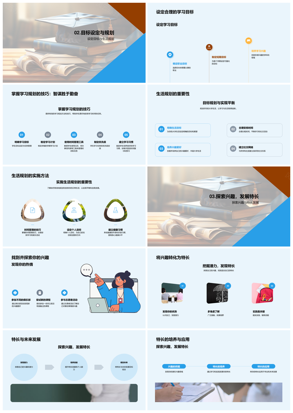 这是一张精彩大学生活规划发掘潜力实现成长目标PPT模板,包含精彩、大学生活、规划、发掘、潜力、实现、成长、目标等主题内容,也可用作精彩大学生活规划发掘、大学生活规划发掘潜力、规划发掘潜力实现、发掘潜力实现成长、潜力实现成长目标、精彩大学生活规划、大学生活规划发掘、规划发掘潜力、发掘潜力实现、潜力实现成长、实现成长目标、精彩大学生活、大学生活规划、规划发掘、发掘潜力等PPT场景使用。 风云办公提供的精彩大学生活规划发掘潜力实现成长目标PPT模板,下载格式为pptx,一共28页,作品中文字及图均可以修改和编辑,图片更改请在作品中右键图片并更换,文字修改请直接点击文字进行修改。