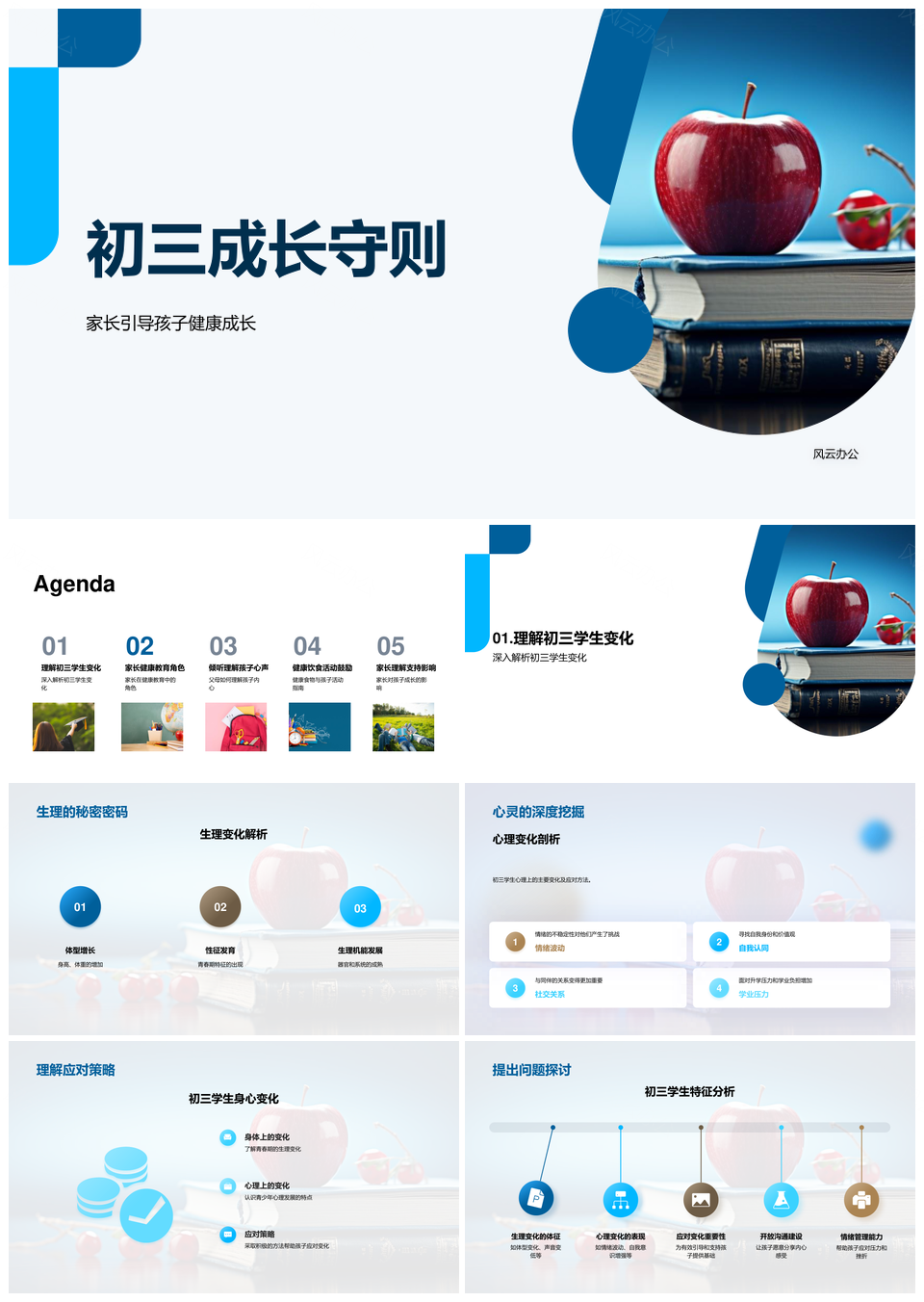 风云办公提供的初三成长守则家长引导身心健康教育PPT模板,下载格式为pptx,一共28页,作品中文字及图均可以修改和编辑,图片更改请在作品中右键图片并更换,文字修改请直接点击文字进行修改。