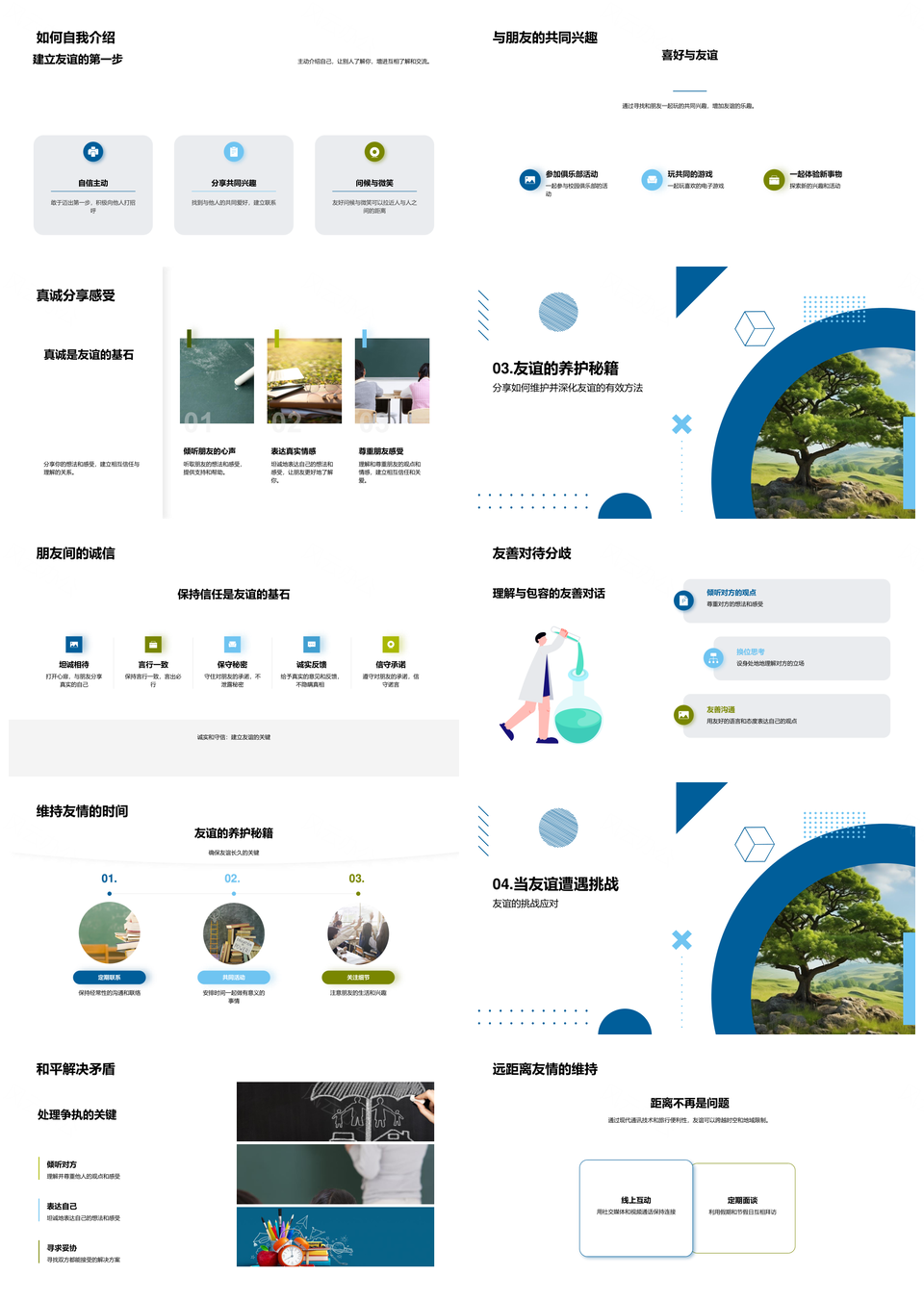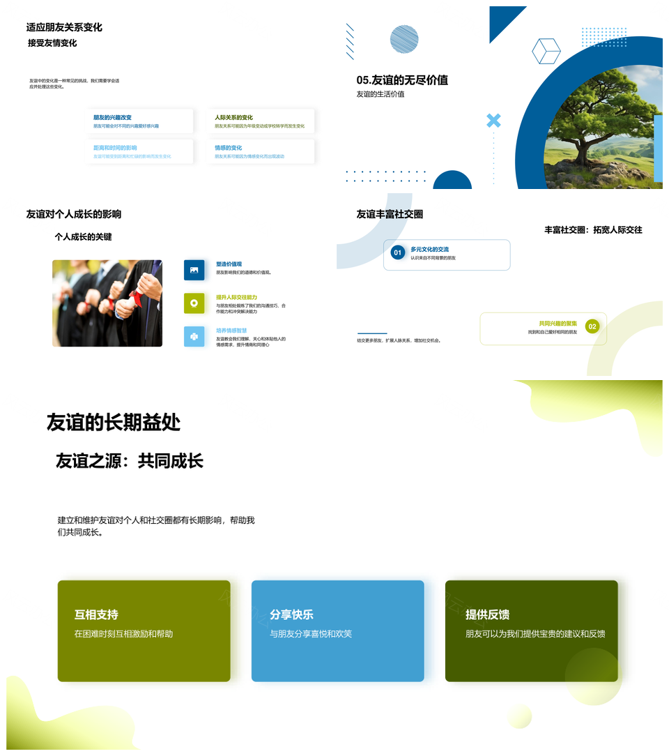 风云办公提供的友谊之树播种养护与人际心理健康PPT模板,下载格式为pptx,一共23页,作品中文字及图均可以修改和编辑,图片更改请在作品中右键图片并更换,文字修改请直接点击文字进行修改。