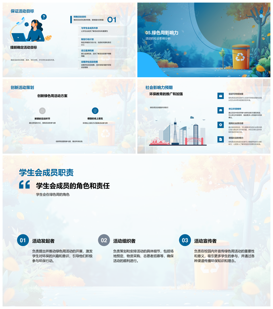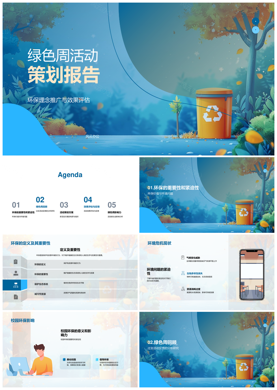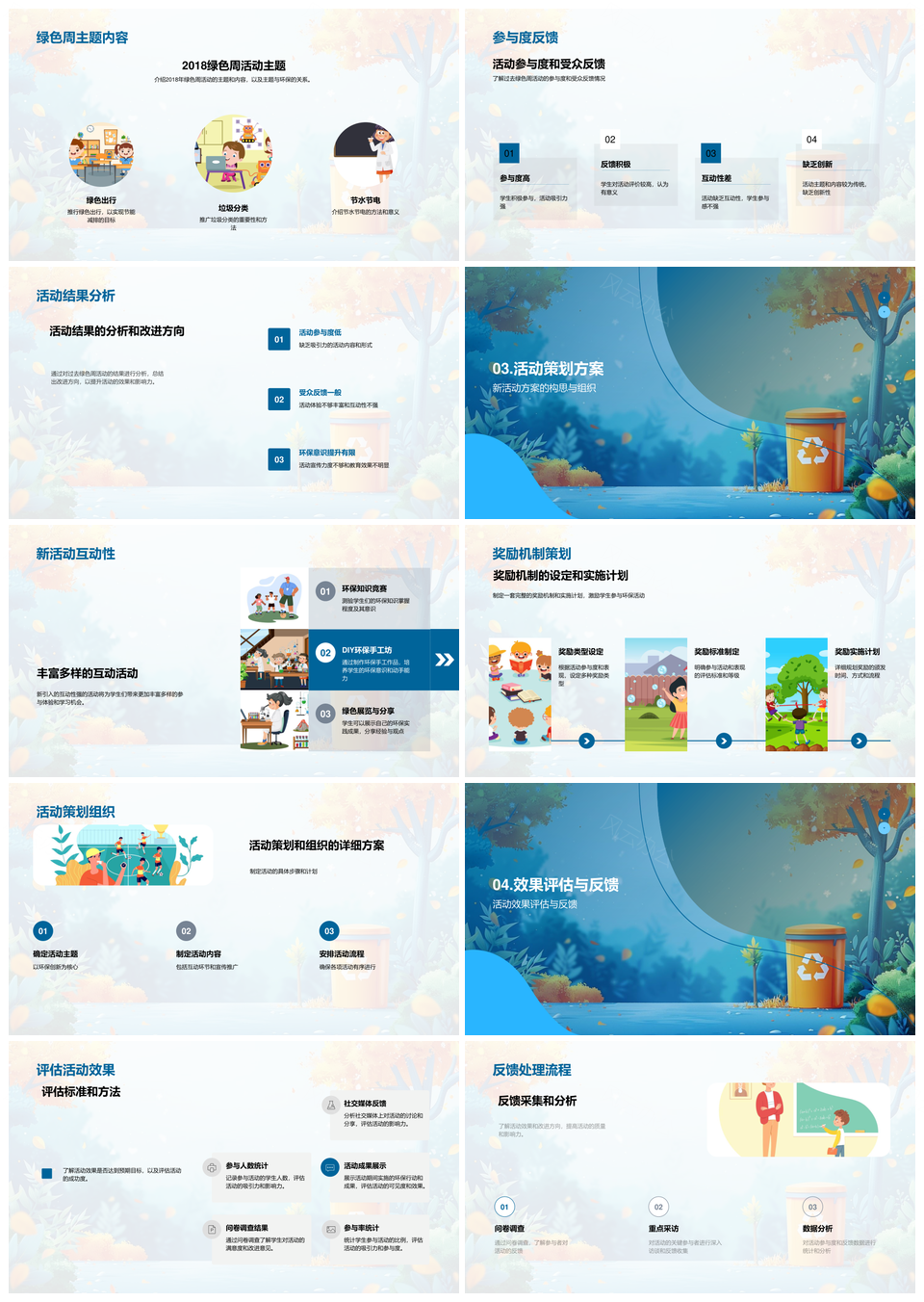 这是一张绿色周校园环保活动策划参与奖励效果分析PPT模板,包含绿色周、校园、环保活动、策划、参与、奖励、效果、分析等主题内容,也可用作绿色周校园环保活动策划、绿色周环保活动策划参与、校园环保活动策划参与、环保活动策划参与奖励效果、绿色周策划参与奖励效果、策划参与奖励效果分析、绿色周校园环保活动、校园环保活动策划、环保活动策划参与、策划参与奖励效果、参与奖励效果分析、绿色周参与奖励效果分析、校园环保活动参与奖励效果、绿色周校园策划参与、环保活动奖励效果分析等PPT场景使用。 风云办公提供的绿色周校园环保活动策划参与奖励效果分析PPT模板,下载格式为pptx,一共23页,作品中文字及图均可以修改和编辑,图片更改请在作品中右键图片并更换,文字修改请直接点击文字进行修改。