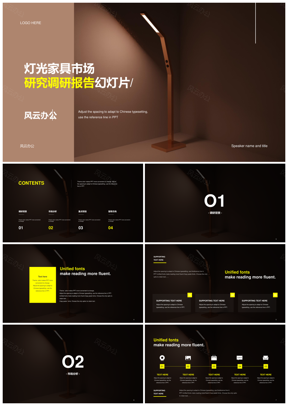风云办公提供的灰色黄色室内灯光家具市场调研报告PPT模板,下载格式为pptx,一共16页,作品中文字及图均可以修改和编辑,图片更改请在作品中右键图片并更换,文字修改请直接点击文字进行修改。