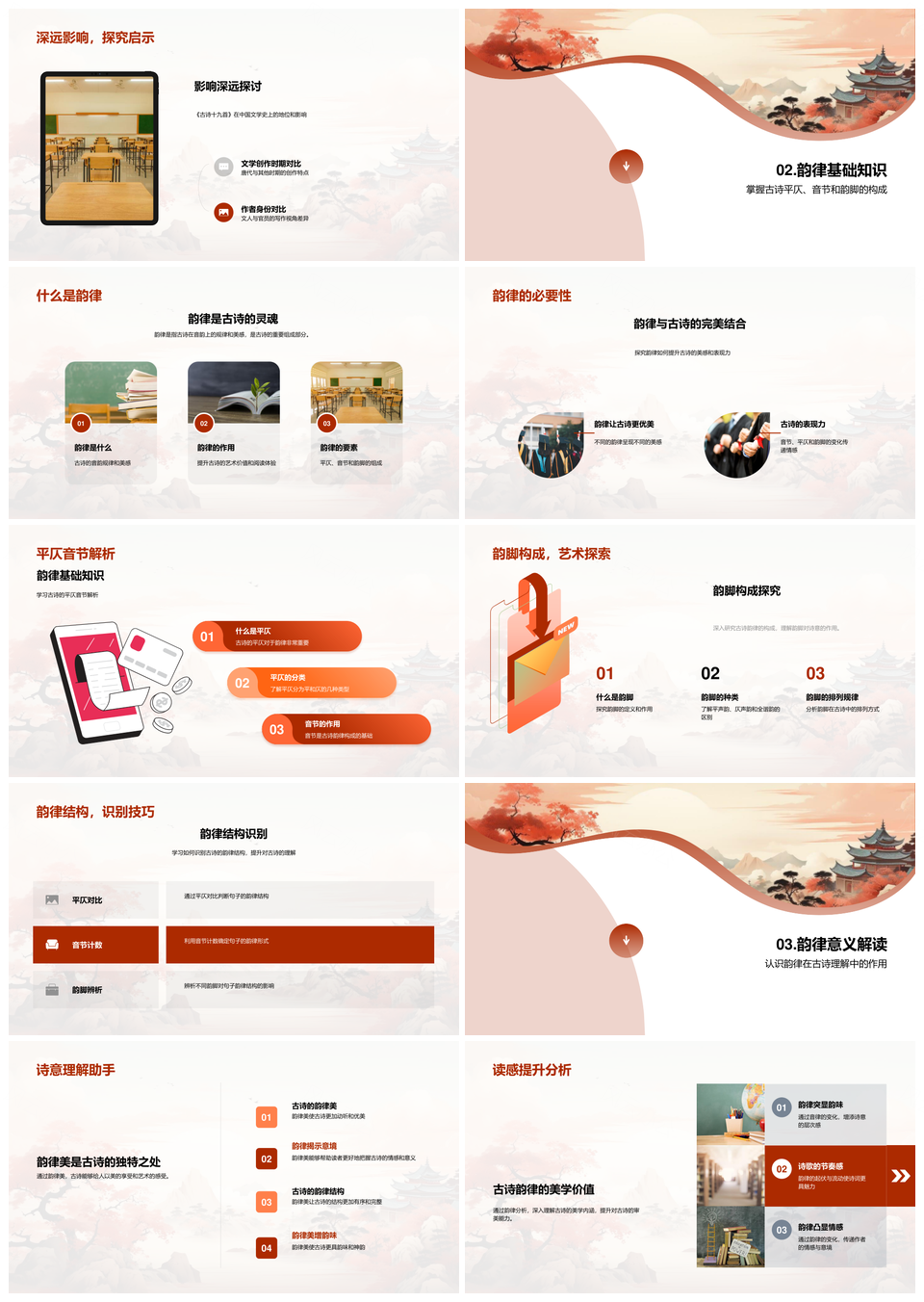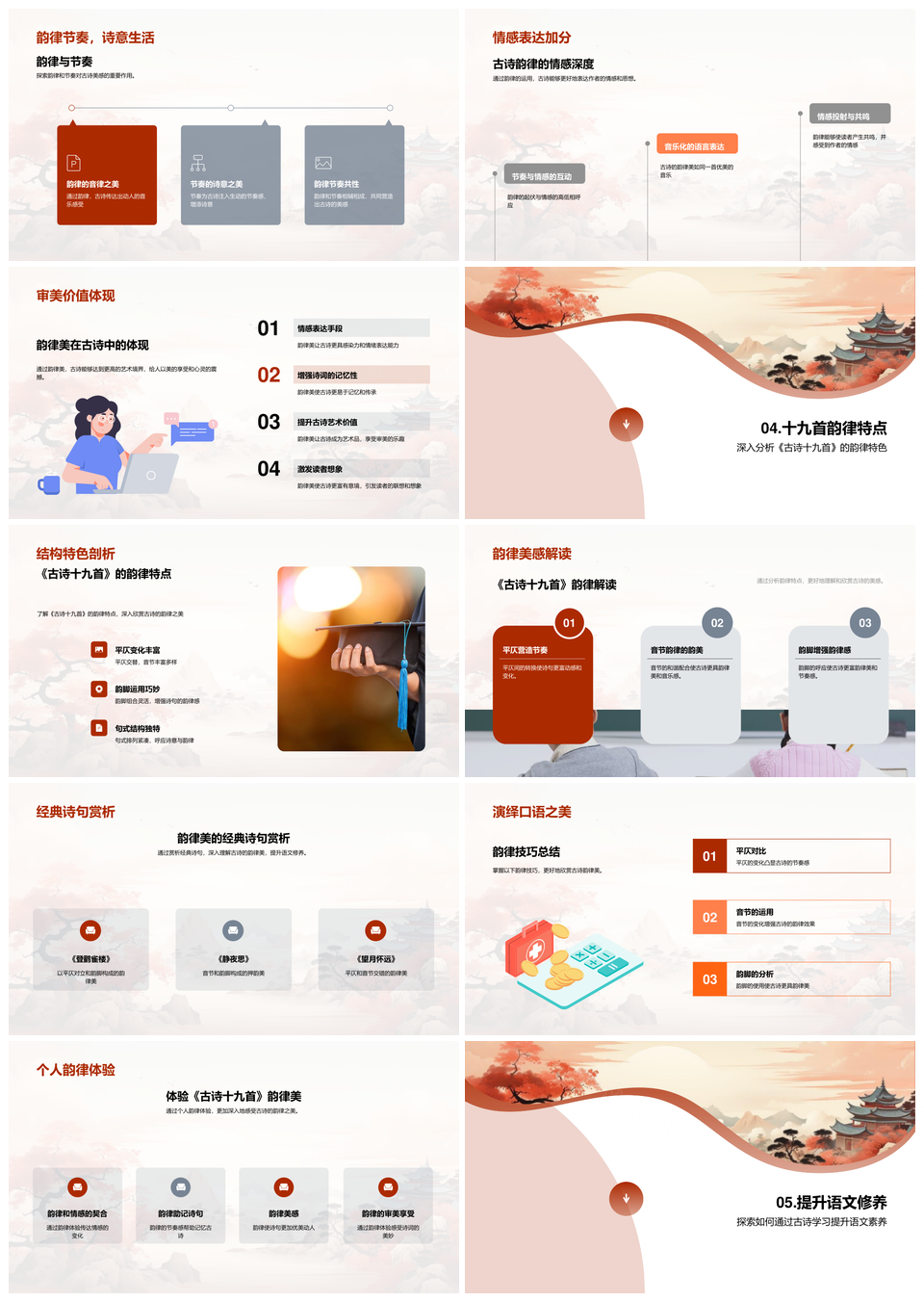 风云办公提供的古诗十九首韵律平仄结构之美PPT模板,下载格式为pptx,一共33页,作品中文字及图均可以修改和编辑,图片更改请在作品中右键图片并更换,文字修改请直接点击文字进行修改。