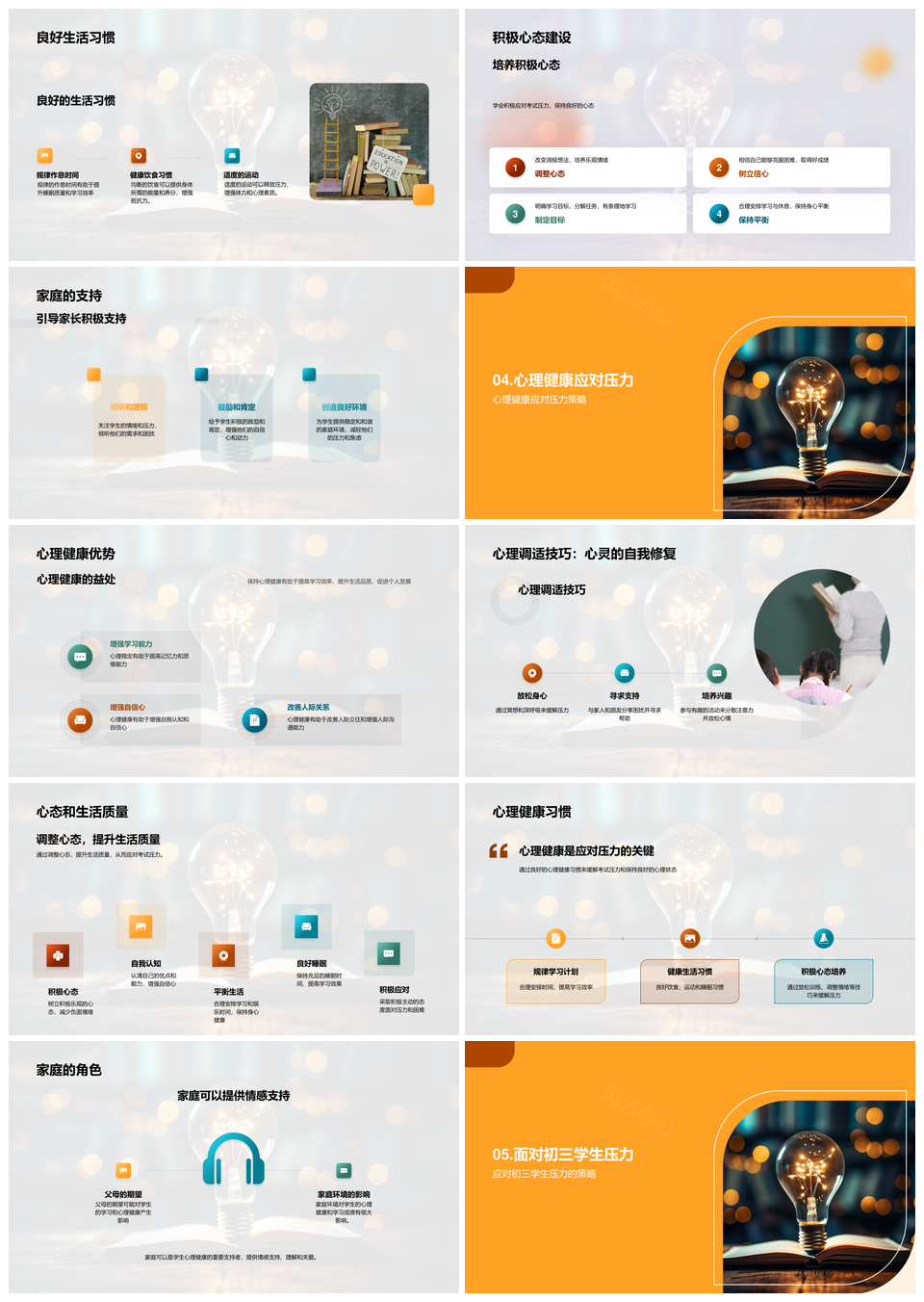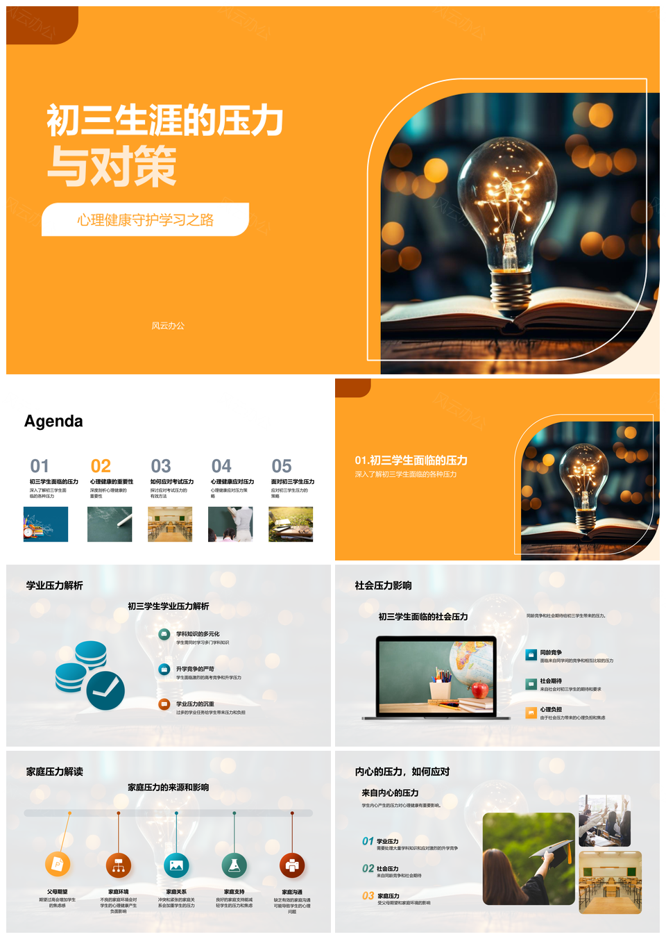 风云办公提供的初三学业家庭社会压力调适发展PPT模板,下载格式为pptx,一共33页,作品中文字及图均可以修改和编辑,图片更改请在作品中右键图片并更换,文字修改请直接点击文字进行修改。
