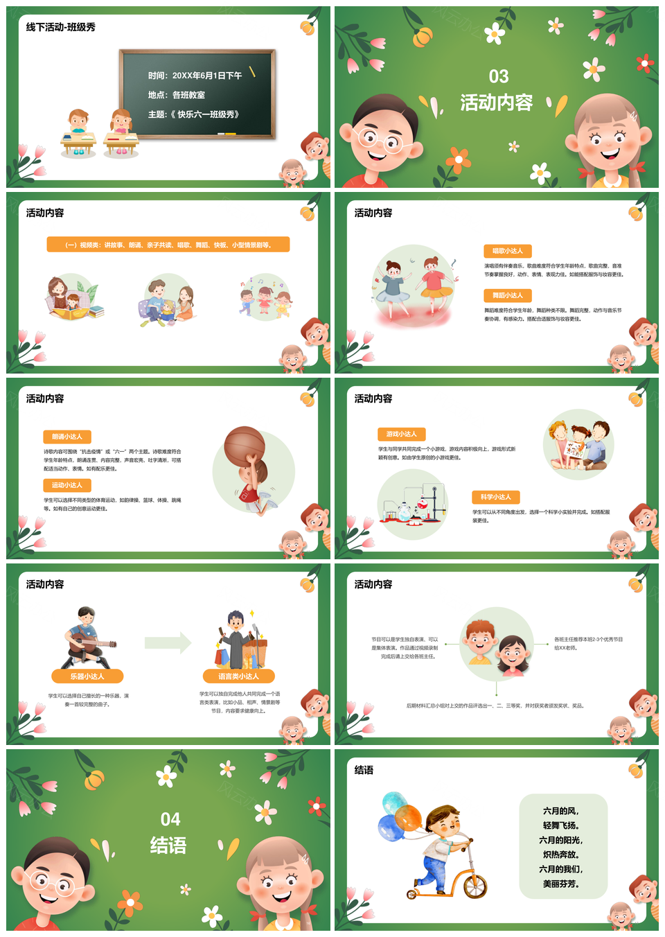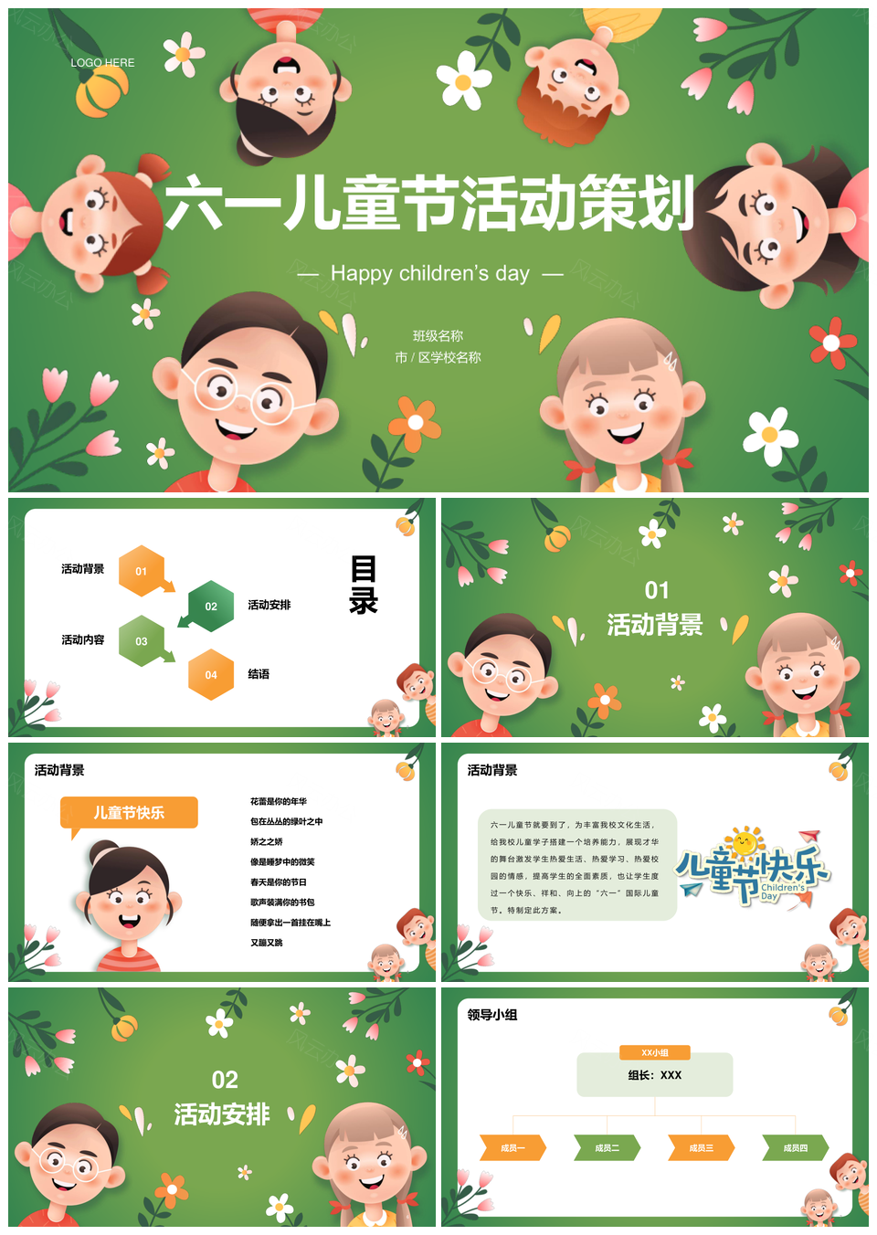绿色小清新卡通六一儿童节活动策划PPT模板