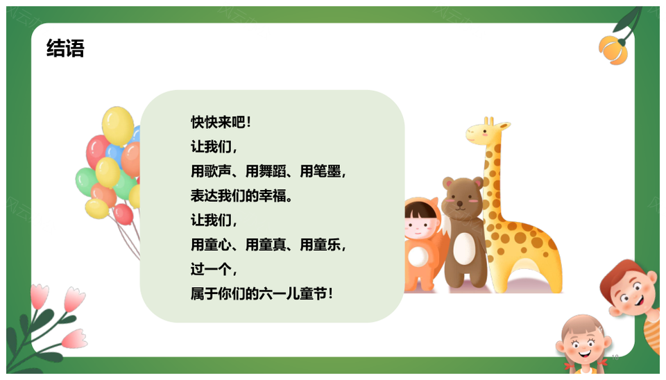 这是一张绿色插画卡通六一儿童节教育营销活动策划PPT模板,包含绿色、插画、卡通、六一儿童节、教育、营销活动、策划等主题内容,也可用作绿色插画卡通六一儿童节、插画卡通六一儿童节教育、卡通六一儿童节教育营销、六一儿童节教育营销活动策划、绿色插画卡通教育、插画卡通教育营销、卡通教育营销活动策划、绿色教育营销活动策划、绿色插画六一儿童节、插画六一儿童节教育、六一儿童节营销活动策划、绿色卡通教育营销、插画教育营销活动策划、卡通六一儿童节活动策划、绿色营销活动策划等PPT场景使用。 风云办公提供的绿色插画卡通六一儿童节教育营销活动策划PPT模板,下载格式为pptx,一共19页,作品中文字及图均可以修改和编辑,图片更改请在作品中右键图片并更换,文字修改请直接点击文字进行修改。
