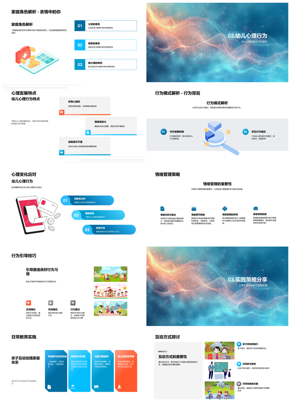 这是一张亲子教育家长教师互动促幼儿心理行为发展PPT模板,包含亲子教育、家长、教师、互动、幼儿、心理、行为、发展等主题内容,也可用作亲子教育家长教师互动、家长教师互动幼儿心理行为、亲子教育家长互动幼儿、教师互动幼儿心理行为、亲子教育教师幼儿心理行为、家长教师幼儿心理行为、互动幼儿心理行为发展、亲子教育幼儿心理行为、教师幼儿心理行为发展、亲子教育家长心理行为、幼儿心理行为发展家长、心理行为发展教师互动、亲子教育互动幼儿发展、家长互动幼儿心理行为、亲子教育教师互动发展等PPT场景使用。 风云办公提供的亲子教育家长教师互动促幼儿心理行为发展PPT模板,下载格式为pptx,一共33页,作品中文字及图均可以修改和编辑,图片更改请在作品中右键图片并更换,文字修改请直接点击文字进行修改。