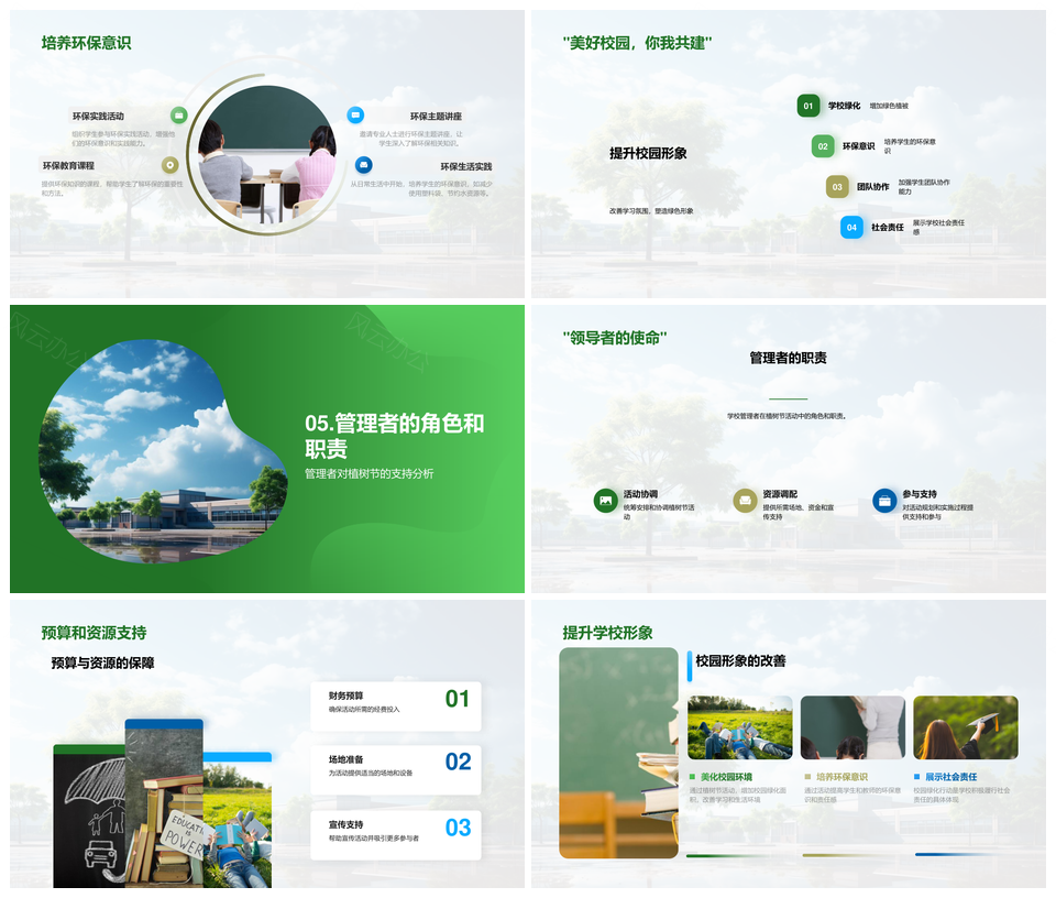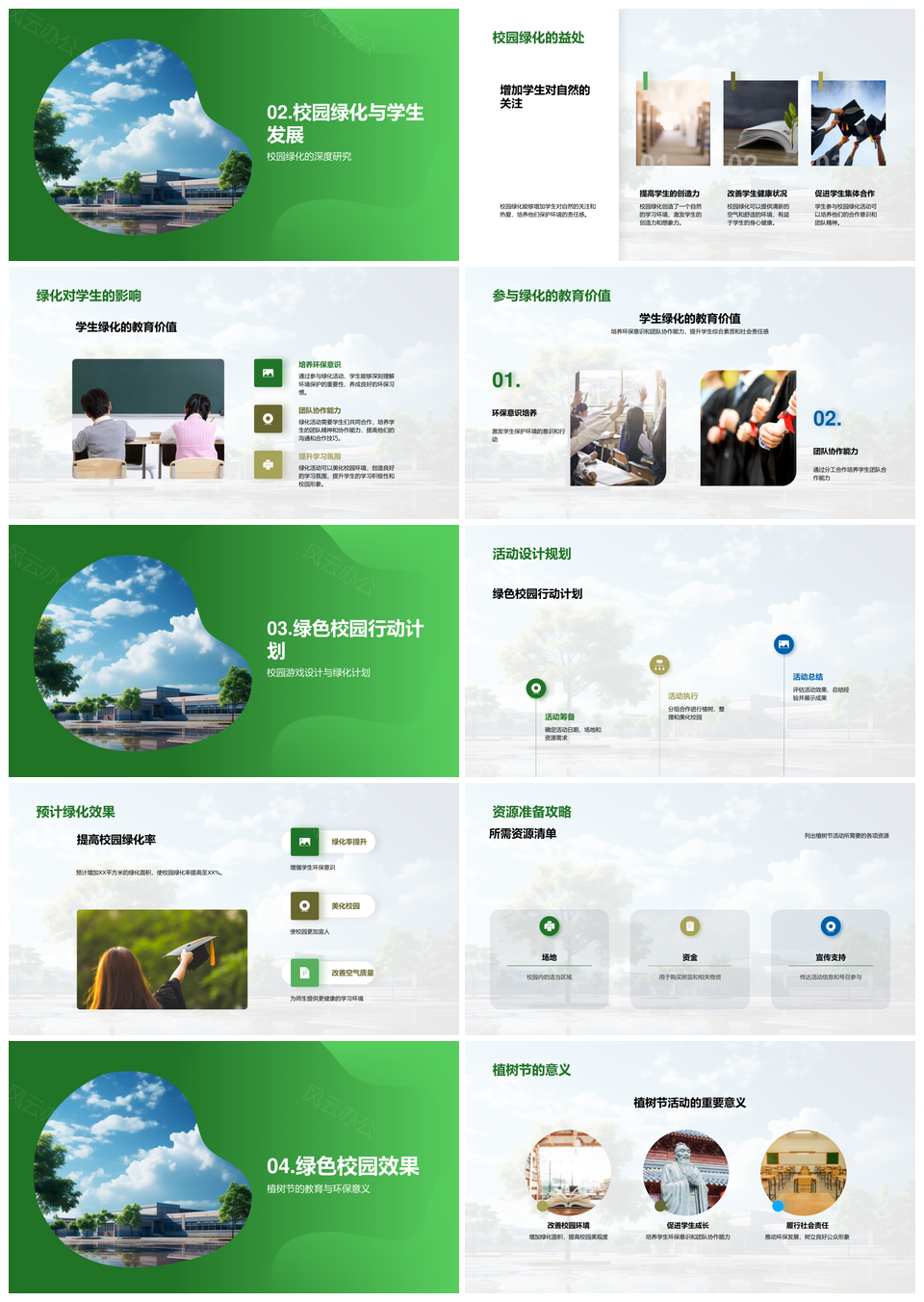 风云办公提供的校园绿化植树节学生环保教育行动PPT模板,下载格式为pptx,一共24页,作品中文字及图均可以修改和编辑,图片更改请在作品中右键图片并更换,文字修改请直接点击文字进行修改。