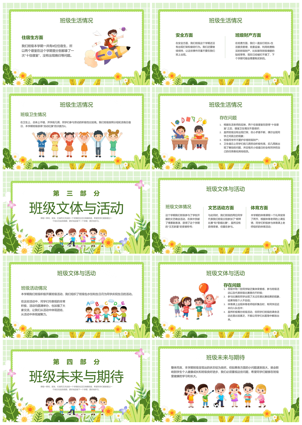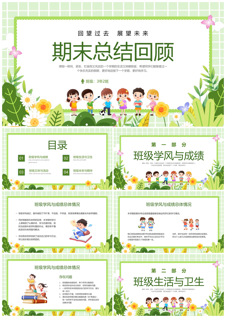 风云办公提供的绿色卡通插画中小学期末班会总结PPT模板,下载格式为pptx,一共22页,作品中文字及图均可以修改和编辑,图片更改请在作品中右键图片并更换,文字修改请直接点击文字进行修改。