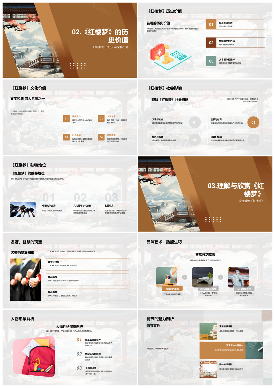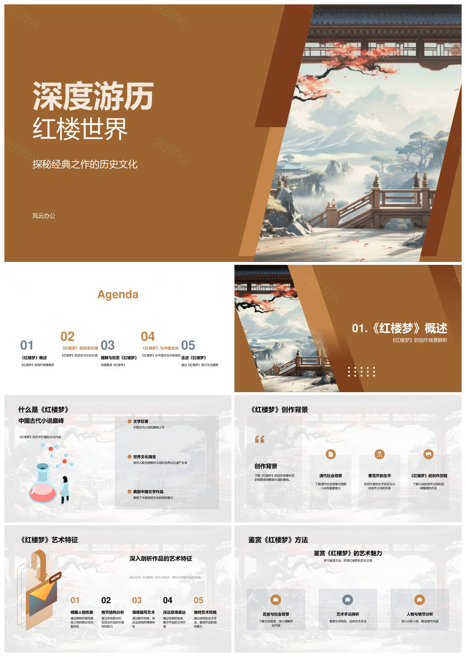 风云办公提供的红楼梦艺术特征历史文化价值探析PPT模板,下载格式为pptx,一共27页,作品中文字及图均可以修改和编辑,图片更改请在作品中右键图片并更换,文字修改请直接点击文字进行修改。
