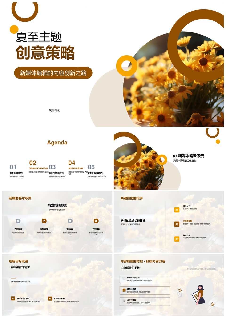 风云办公提供的新媒体夏至向日葵创意内容策略PPT模板,下载格式为pptx,一共33页,作品中文字及图均可以修改和编辑,图片更改请在作品中右键图片并更换,文字修改请直接点击文字进行修改。