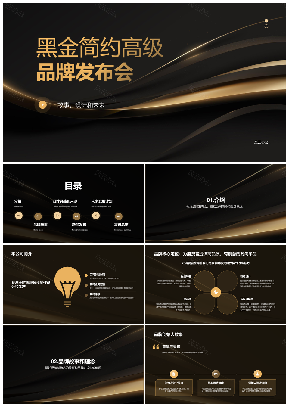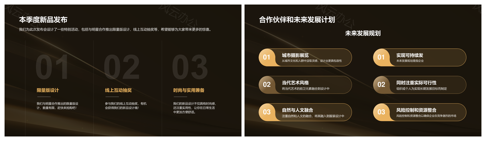 风云办公提供的黑金简约高级IT品牌发布会模板,下载格式为pptx,一共20页,作品中文字及图均可以修改和编辑,图片更改请在作品中右键图片并更换,文字修改请直接点击文字进行修改。