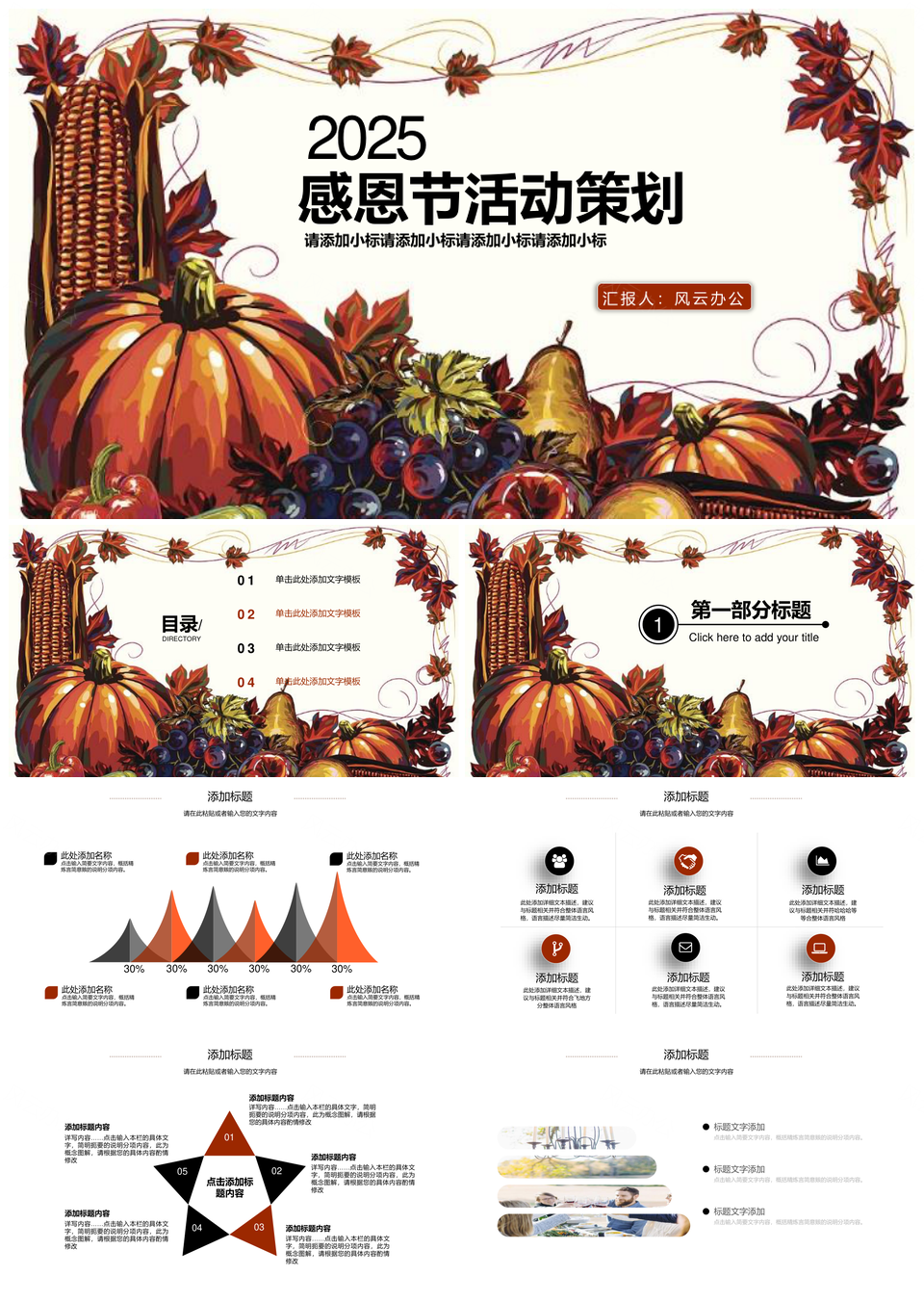 这是一张2025感恩节活动策划PPT模板,包含2025、感恩节、活动策划等主题内容,也可用作2025、感恩节、活动、策划 2025感恩节活动策划、2025感恩节活动、2025感恩节策划、2025活动策划、感恩节活动策划、2025感恩节、2025活动、2025策划、感恩节活动、感恩节策划、活动策划等PPT场景使用。 风云办公提供的2025感恩节活动策划PPT模板,下载格式为pptx,一共30页,作品中文字及图均可以修改和编辑,图片更改请在作品中右键图片并更换,文字修改请直接点击文字进行修改。