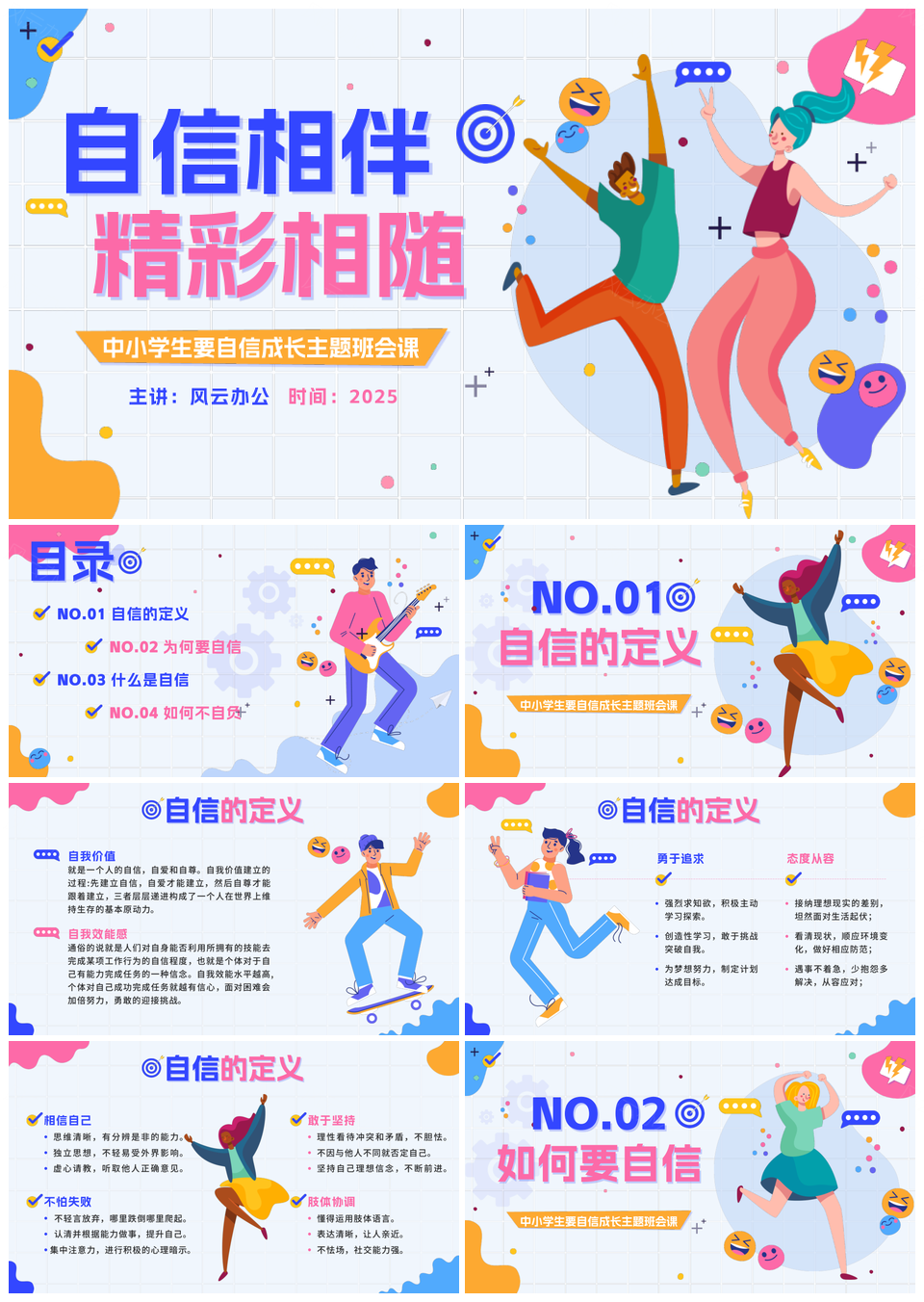 风云办公提供的2025自信激励成长卡通班会课PPT模板,下载格式为pptx,一共19页,作品中文字及图均可以修改和编辑,图片更改请在作品中右键图片并更换,文字修改请直接点击文字进行修改。