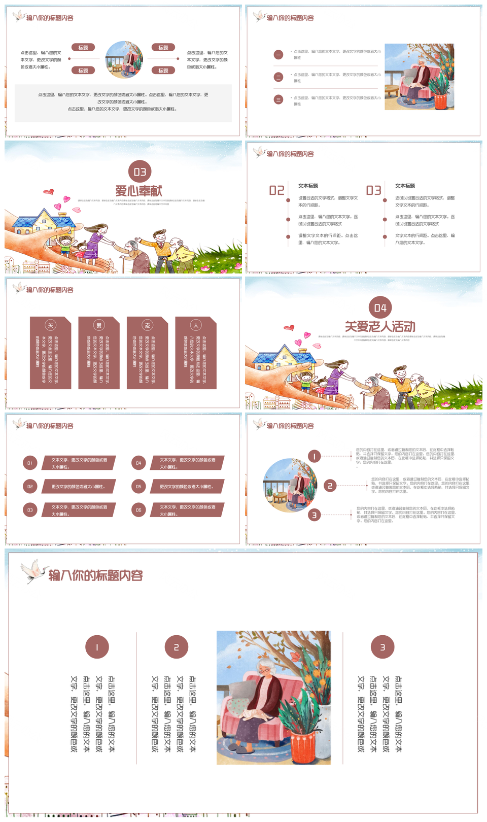 这是一张彩色大气关爱老年人公益宣传PPT模板,包含彩色、大气、关爱、老年人、公益宣传等主题内容,也可用作关爱老年人公益宣传、彩色大气关爱老年人、关爱老年人公益、老年人公益宣传、彩色大气关爱、大气关爱老年人、彩色大气、关爱老年人、老年人公益、公益宣传等PPT场景使用。 风云办公提供的彩色大气关爱老年人公益宣传PPT模板,下载格式为pptx,一共17页,作品中文字及图均可以修改和编辑,图片更改请在作品中右键图片并更换,文字修改请直接点击文字进行修改。