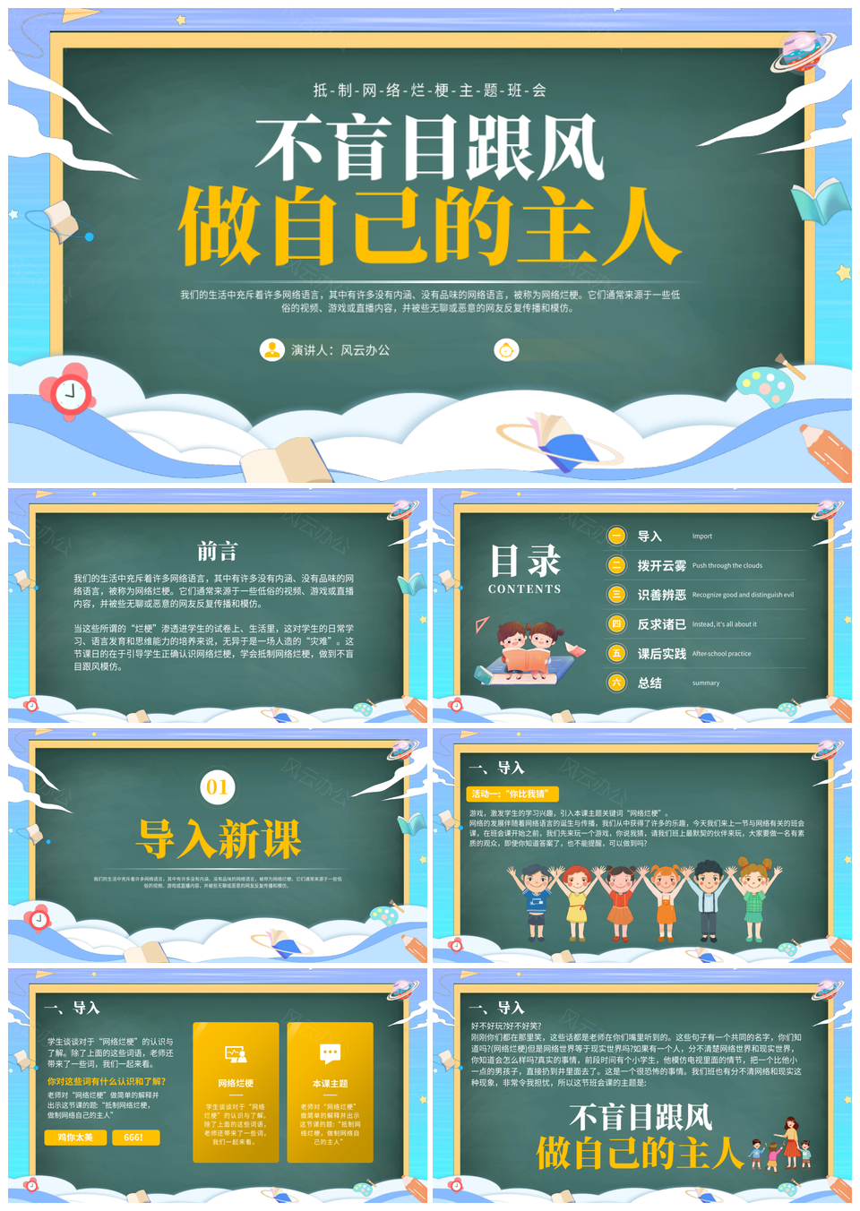 风云办公提供的抵制网络烂梗健康成长主题班会PPT模板,下载格式为pptx,一共28页,作品中文字及图均可以修改和编辑,图片更改请在作品中右键图片并更换,文字修改请直接点击文字进行修改。